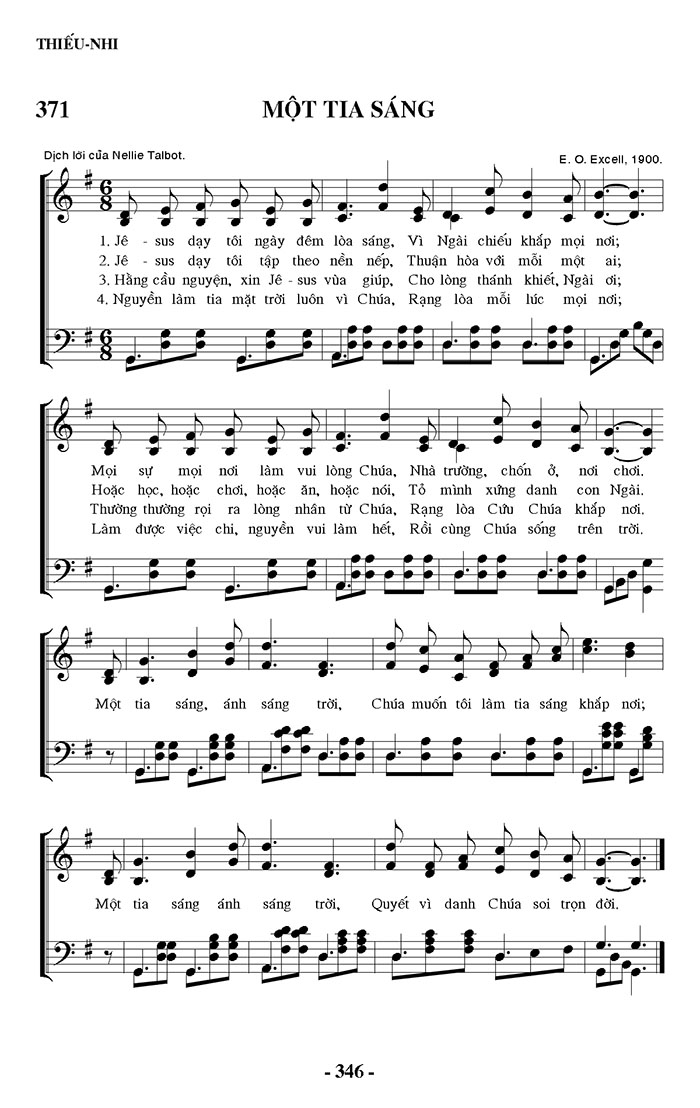 1. Jê-sus dạy tôi ngày đêm lòa sáng, Vì Ngài chiếu khắp mọi nơi; Mọi sự mọi nơi làm vui lòng Chúa, Nhà trường, chốn ở, nơi chơi. Một tia sáng, ánh sáng trời, Chúa muốn tôi làm tia sáng khắp nơi; 2. Jê-sus dạy tôi tập theo nền nếp, Thuận hòa với mỗi một ai; Hoặc học, hoặc chơi, hoặc ăn, hoặc nói, Tỏ mình xứng danh con Ngài. Một tia sáng, ánh sáng trời, Chúa muốn tôi làm tia sáng khắp nơi; 3. Hằng cầu nguyện, xin Jê-sus vùa giúp, Cho lòng thánh khiết, Ngài ơi; Thường thường rọi ra lòng nhân từ Chúa, Rạng lòa Cứu Chúa khắp nơi. Một tia sáng, ánh sáng trời, Chúa muốn tôi làm tia sáng khắp nơi; 4. Nguyện làm tia mặt trời luôn vì Chúa, Rạng lòa mỗi lúc mọi nơi; Làm được việc chi, nguyền vui làm hết, Rồi cùng Chúa sống trên trời. Một tia sáng, ánh sáng trời, Chúa muốn tôi làm tia sáng khắp nơi; Điệp khúc: Một tia sáng ánh sáng trời, Quyết vì danh Chúa soi trọn đời.