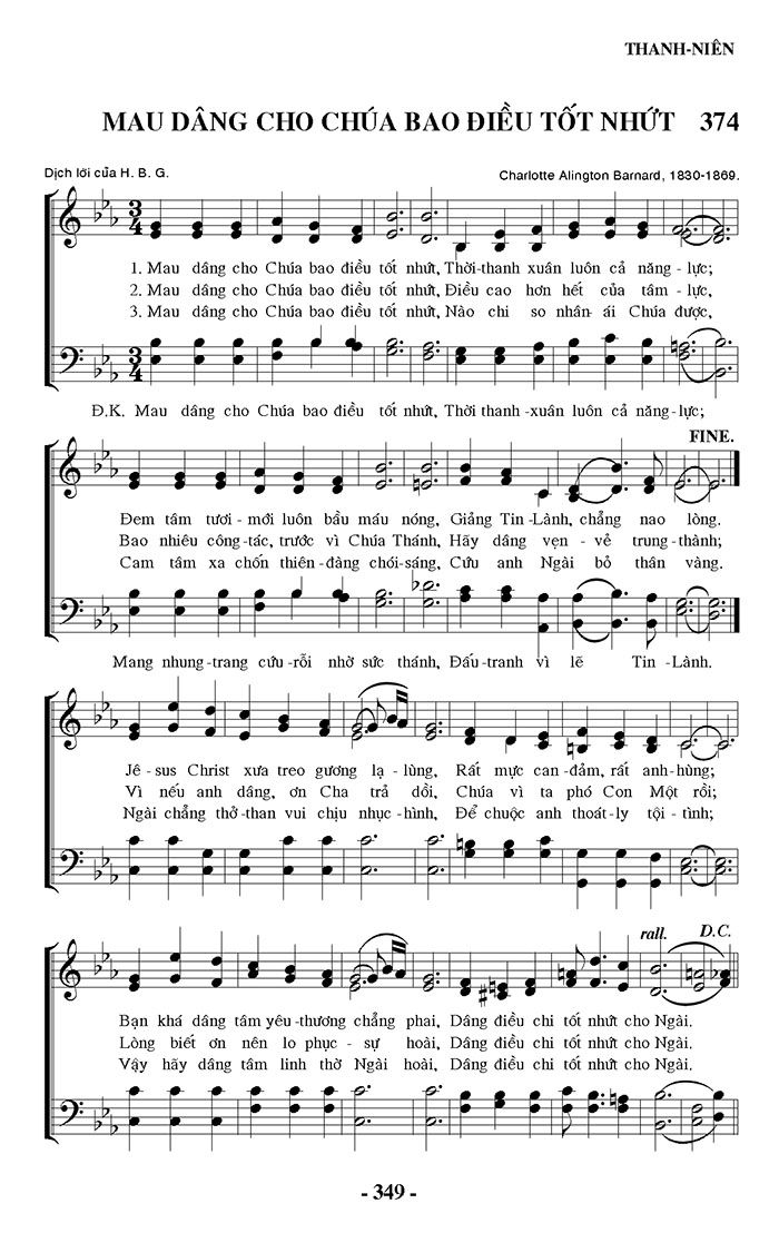 1. Mau dâng cho Chúa bao điều tốt nhứt, Thời thanh xuân luôn cả năng lực; Đem tâm tươi - mới luôn bầu máu nóng, Giảng Tin Lành, chẳng nao lòng. Jêsus Christ xưa treo gương lạ lùng, Rất mực can đảm, rất anh hùng; Bạn khá dâng tâm yêu thương chẳng phai, Dâng điều chỉ tốt nhứt cho Ngài. 2. Mau dâng cho Chúa bao điều tốt nhứt, Điều cao hơn hết của tâm lực, Bao nhiêu công tác, trước vì Chúa Thánh, Hãy dâng vẹn vẻ trung thành; Vì nếu anh dâng, ơn Cha trả dồi, Chúa vì ta phó Con Một rồi; Lòng biết ơn nên lo phục sự hoài, Dâng điều chỉ tốt nhứt cho Ngài. 3. Mau dâng cho Chúa bao điều tốt nhứt, Nào chi so nhân ái Chúa được, Cam tâm xa chốn thiên đàng chói sáng, Cứu anh Ngài bỏ thân vàng. Ngài chẳng thở than vui chịu nhục hình, Để chuộc anh thoát ly tội tình; Vậy hãy dâng tâm linh thờ Ngài hoài, Dâng điều chỉ tốt nhứt cho Ngài. Điệp khúc: Mau dâng cho Chúa bao điều tốt nhứt, Thời thanh xuân luôn cả năng lực; Mang nhung trang cứu rỗi nhờ sức thánh, Đấu tranh vì lẽ Tin Lành.