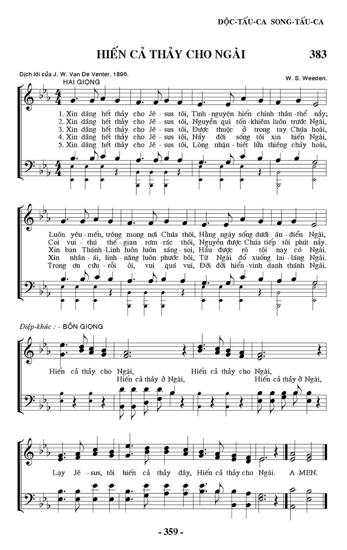 1. Xin dâng hết thảy cho Jê - sus tôi, Tình - nguyện hiến chính thân - thể nầy; Luôn yêu mến, trông mong nơi Chúa thôi, Hằng ngày sống dưới ân - điển Ngài. 2. Xin dâng hết thảy cho Jê - sus tôi, Nguyễn quì tốn khiêm luôn trước Ngài, Coi vui thú thế - gian rơm - rác thôi, Nguyễn được Chúa tiếp tôi phút nấy. 3. Xin dâng hết thảy cho Jê - sus tôi, Được thuộc ở trong tay Chúa hoài, Xin ban Thánh Linh luôn luôn sáng soi, Hầu được rõ tôi nay có Ngài. 4. Xin dâng hết thảy cho Jê - sus tôi, Nầy đời sống tôi xin hiến Ngài, Xin nhân ái, linh - năng luôn phước bôi, Từ Ngài đổ xuống lai - láng Ngài. 5. Xin dâng hết thảy cho Jê - sus tôi, Lòng nhận biết lửa thiêng cháy hoài, Trong ơn cứu rỗi ôi, vui quá vui, Đời đời hiển - vinh danh thánh Ngài. Điệp khúc: Hiến cả thảy cho Ngài, Hiến cả thảy cho Ngài, Hiến cả thảy ở Ngài, Hiến cả thảy ở Ngài, Lạy Jê - sus, tôi hiến cả thảy đây, Hiến cả thảy cho Ngài. A -MEN.