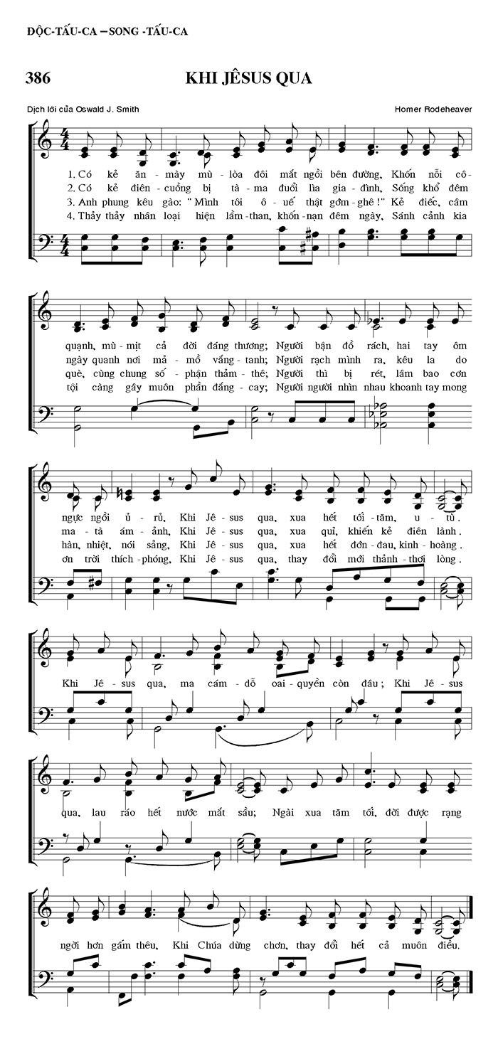 1. Có kẻ ăn mày mù lòa đôi mắt ngồi bên đường, Khốn nỗi cô quạnh, mù mịt cả đời đáng thương; Người bận đồ rách, hai tay ôm ngực ngồi ủ rủ, Khi Jê-sus qua, xua hết tối tăm, u-tù. Khi Jê-sus qua, ma cám dỗ oai-quyền còn đâu; Khi Jê-sus qua, lau ráo hết nước mắt sầu; Ngài xua tăm tối, đời được rạng ngời hơn gấm thêu, Khi Chúa dừng chơn, thay đổi hết cả muôn điều. 2. Có kẻ điên cuồng bị tà ma đuổi lìa gia đình, Sống khổ đêm ngày quanh nơi mả mồ vắng-tanh; Người rạch mình ra, kêu la do ma tà ám ảnh, Khi Jê-sus qua, xua quỉ, khiến kẻ điên lành. Khi Jê-sus qua, ma cám dỗ oai-quyền còn đâu; Khi Jê-sus qua, lau ráo hết nước mắt sầu; Ngài xua tăm tối, đời được rạng ngời hơn gấm thêu, Khi Chúa dừng chơn, thay đổi hết cả muôn điều. 3. Anh phung kêu gào: "Mình tôi ô uế thật gớm-ghê!" Kẻ điếc, câm què, cùng chung số phận thảm-thê; Người thì bị rét, lâm bao cơn hàn, nhiệt, nói sảng, Khi Jê-sus qua, xua hết đớn-đau, kinh-hoàng. Khi Jê-sus qua, ma cám dỗ oai-quyền còn đâu; Khi Jê-sus qua, lau ráo hết nước mắt sầu; Ngài xua tăm tối, đời được rạng ngời hơn gấm thêu, Khi Chúa dừng chơn, thay đổi hết cả muôn điều. 4. Thảy thảy nhân loại hiện lầm-than, khốn-nạn đêm ngày, Sánh cảnh kia tội càng gây muôn phần đắng cay; Người người nhìn nhau khoanh tay mong ơn trời thích-phóng, Khi Jê-sus qua, thay đổi mới thảnh thơi lòng. Khi Jê-sus qua, ma cám dỗ oai-quyền còn đâu; Khi Jê-sus qua, lau ráo hết nước mắt sầu; Ngài xua tăm tối, đời được rạng ngời hơn gấm thêu, Khi Chúa dừng chơn, thay đổi hết cả muôn điều.