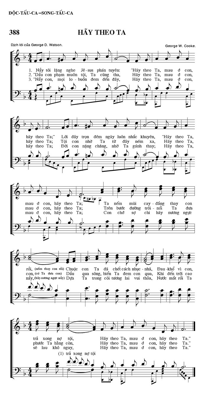 1. Nầy tôi lặng nghe Jê-sus phán tuyên: "Hãy theo Ta, mau ở con, hãy theo Ta;" Lời đây trọn đêm ngày luôn nhắc khuyên, "Hãy theo Ta, mau ở con, hãy theo Ta;" Ta nếm mùi cay đắng thay con rồi, (nếm thay con rồi) Chuộc con Ta đã chết cách nhục - nhã, Đau khổ vì con, trả xong nợ tội, Hãy theo Ta, mau ở con, hãy theo Ta." 2. Dầu con phạm muôn tội, Ta cũng tha, Hãy theo Ta, mau ở con, hãy theo Ta; Tội con nhờ Ta từ đây ném xa, Hãy theo Ta, mau ở con, hãy theo Ta; Trên bước đường trôi - nổi Ta đưa con, (có Ta đưa con) Dầu qua sông, biển Ta đem con qua, Khi đến trời cao phước Ta hằng còn, Hãy theo Ta, mau ở con, hãy theo Ta." 3. Nầy con, mọi lo buồn đem đến đây, Hãy theo Ta, mau ở con, hãy theo Ta; Đời con nặng chăng, nhờ Ta gánh thay; Hãy theo Ta, mau ở con, hãy theo Ta; Con chớ sợ chi hãy nương ngực nầy, (hãy nương ngực nấy) Dựa Ta trong cõi tương lai vui thỏa, Nước mắt rồi Ta sẽ lau khô ngay, Hãy theo Ta, mau ở con, hãy theo Ta." Outro: (1) trả xong nợ tội