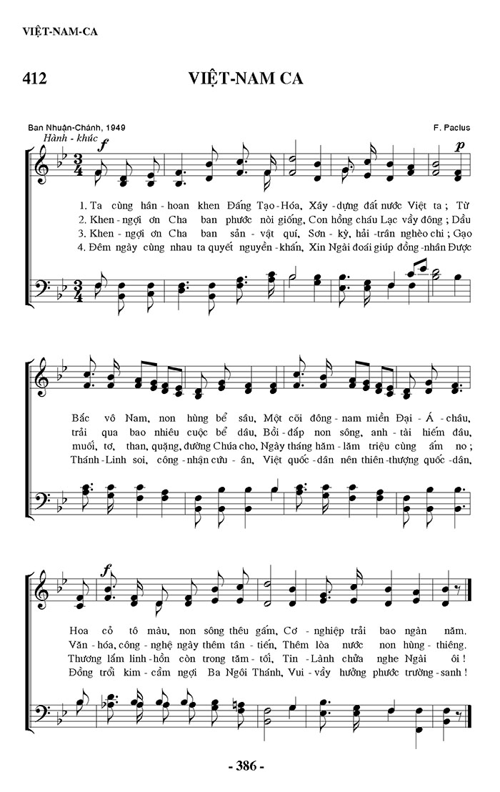 1. Ta cùng hân - hoan khen Đấng Tạo-Hóa, Xây - dựng đất nước Việt ta; Từ Bắc vô Nam, non hùng bể sâu, Một cõi đông - nam miền Đại - Á - châu, Hoa cỏ tô màu, non sông thêu gấm, Cơ - nghiệp trải bao ngàn năm. 2. Khen - ngợi ơn Cha ban phước nòi giống, Con hồng cháu Lạc vầy đông; Dầu trải qua bao nhiêu cuộc bể dâu, Bồi - đắp non sông, anh tài hiếm đâu, Văn - hóa, công - nghệ ngày thêm tân - tiến, Thêm lòa nước non hùng - thiêng. 3. Khen - ngợi ơn Cha ban sản - vật quí, Sơn kỳ, hải trân nghèo chi; Gạo muối, tơ, than, quặng, đường Chúa cho, Ngày tháng hăm - lăm triệu cùng ấm no; Thương lắm linh - hồn còn trong tăm - tối, Tin - Lành chửa nghe Ngài ôi ! 4. Đêm ngày cùng nhau ta quyết nguyền - khấn, Xin Ngài đoái giúp đồng - nhân Được Thánh - Linh soi, công - nhận cứu - ân, Việt quốc - dân nên thiên - thượng quốc - dân, Đồng trổi kim - cầm ngợi Ba Ngôi Thánh, Vui - vầy hưởng phước trường - sanh!
