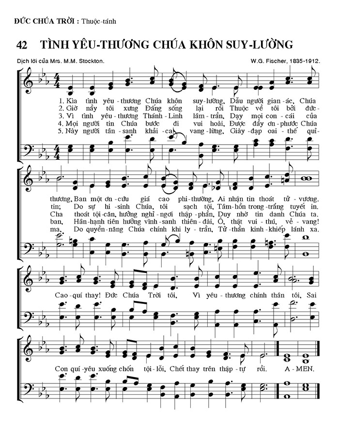 1. Kìa tình yêu - thương Chúa khôn suy-lường, Dẫu người gian ác, Chúa thương, Ban một ơn - cứu giá cao phi-thường, Ai nhận tin thoát tử - vương. 2. Giờ nầy tôi xưng Đấng sống lại rồi Thuộc về tôi bởi đức - tin; Do sự hi sinh Chúa, tôi sạch tội, Tâm hồn trong trắng tuyết in. 3. Vì tình yêu - thương Thánh - Linh lâm - trần, Dạy mọi con - cái của Cha thoát tội căn, hưởng nghỉ ngơi thập phần, Duy nhờ tin danh Chúa ta. 4. Mọi người tin Chúa bước đi vui hoài, Được đầy ơn - phước Chúa ban, Hân hạnh tiên hưởng vĩnh - sanh thiên - đài, Ô, thật vui - thú, vẻ vang! 5. Này người tân - sanh khải - ca vang - lừng, Giày - đạp oai thế quỉ - ma, Do quyền năng Chúa chính khi ly - trần, Tử - thần kinh - khiếp lánh xa. Điệp khúc: Cao-quí thay! Đức Chúa Trời tôi, Vì yêu - thương chính thân tôi, Sai Con quí yêu xuống chốn tội lỗi, Chết thay trên thập - tự rồi. A - MEN.