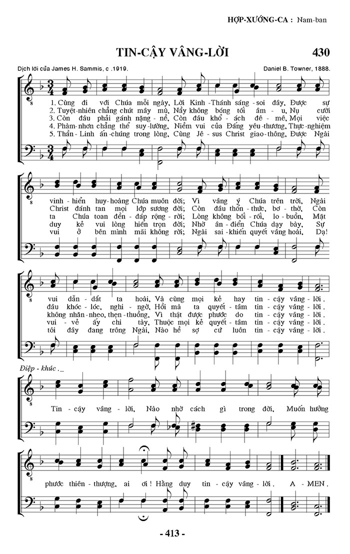 1. Cùng đi với Chúa mỗi ngày, Lời Kinh-Thánh sáng soi đây, Được sự vinh hiển huy hoàng Chúa muôn đời; Vì vâng ý Chúa trên trời, Ngài vui dẫn dắt ta hoài, Và cùng mọi kẻ hay tin-cậy vâng-lời. 2. Tuyệt-nhiên chẳng chút mây mù, Nầy không bóng tối âm-u, Nụ cười Christ đánh tan mọi lớp sương đời; Còn đâu thổn thức, bơ-thờ, Còn đâu khóc-lóc, nghi-ngờ, Hồi mà ta quyết-tâm tin-cậy vâng-lời. 3. Còn đâu phải gánh nặng nề, Còn đâu khổ ách đê-mê, Mọi việc ta Chúa toan đền-đáp rộng-rời; Lòng không bối-rối, lo buồn, không nhăn nheo, thẹn-thuồng. Vì thật được phước do tin-cậy vâng-lời. 4. Phàm-nhơn chẳng thể suy lường, Niềm vui của Đấng yêu thương, Thực-nghiệm duy kẻ vui lòng hiến trọn đời; Nhờ ân-điển Chúa dạy bày, Sự vui vẻ ấy chi tày, Thuộc mọi kẻ quyết-tâm tin-cậy vâng-lời. 5. Thần-Linh ấn-chứng trong lòng, Cùng Jê-sus Christ giao-thông, Được Ngài vui ở bên mình mãi không rời; Ngài sai-khiến quyết vâng hoài, Dạ! tôi đây đang trông Ngài, Nào hề sợ cứ luôn tin-cậy vâng-lời. Điệp khúc: Tin-cậy vâng-lời, Nào nhờ cách gì trong đời, Muốn hưởng phước thiên-thượng, ai ơi! Hằng duy tin-cậy vâng-lời. A-MEN.