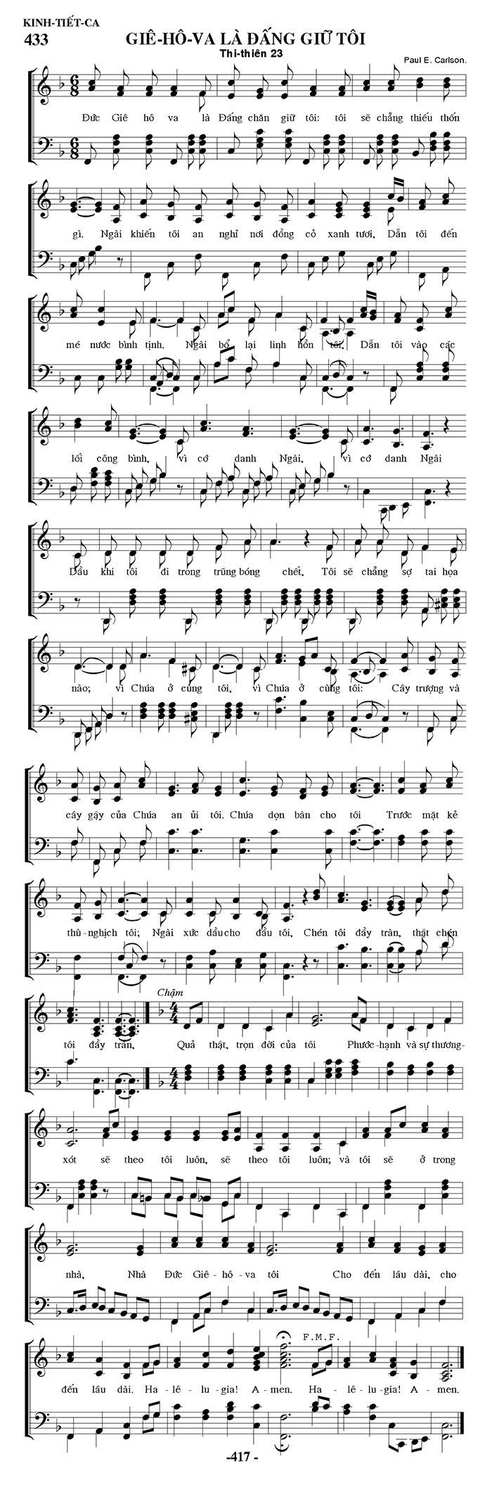1. Đức Giê-hô-va là Đấng chăn giữ tôi: tôi sẽ chẳng thiếu thốn gì. Ngài khiến tôi an nghỉ nơi đồng cỏ xanh tươi, Dẫn tôi đến mé nước bình tịnh. Ngài bổ lại linh hồn tôi, Dẫn tôi vào các lối công bình, vì cớ danh Ngài, vì cớ danh Ngài. Dầu khi tôi đi trong trũng bóng chết, Tôi sẽ chẳng sợ tai họa nào; vì Chúa ở cùng tôi, vì Chúa ở cùng tôi: Cây trượng và cây gậy của Chúa an ủi tôi. Chúa dọn bàn cho tôi Trước mặt kẻ thù-nghịch tôi; Ngài xức dầu cho đầu tôi, Chén tôi đầy tràn, thật chén tôi đầy tràn. Quả thật, trọn đời của tôi Phước-hạnh và sự thương-xót sẽ theo tôi luôn, sẽ theo tôi luôn; và tôi sẽ ở trong nhà, Nhà Đức Giê-hô-va tôi Cho đến lâu dài, cho đến lâu dài. Ha-lê-lu-gia! A-men. Ha-lê-lu-gia! A-men.