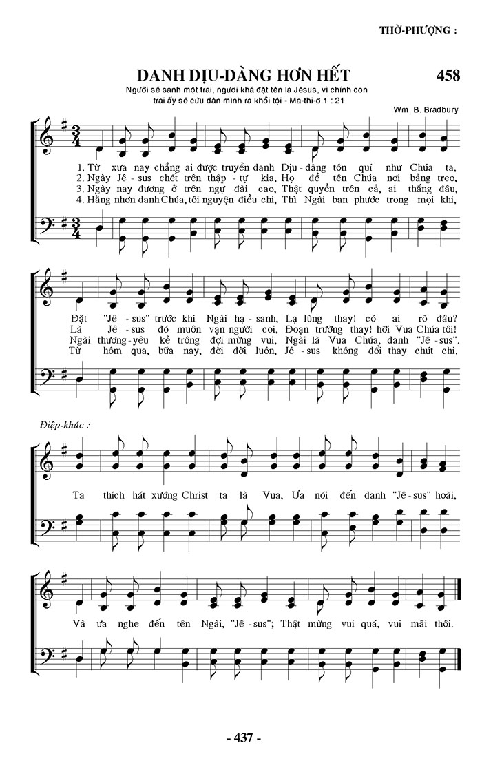 1. Từ xưa nay chẳng ai được truyền danh Dịu - dàng tôn quí như Chúa ta, Đặt "Jê-sus" trước khi Ngài hạ sanh, Lạ lùng thay! có ai rõ đâu? 2. Ngày Jê-sus chết trên thập tự kia, Họ đề tên Chúa nơi bảng treo, Là Jê-sus đó muôn vạn người coi, Đoạn trường thay! hởi Vua Chúa tôi! 3. Ngày nay đương ở trên ngự đài cao, Thật quyền trên cả, ai thắng đầu, Ngài thương yêu kẻ trông đợi mừng vui, Ngài là Vua Chúa, danh "Jê-sus". 4. Hằng nhơn danh Chúa, tôi nguyện điều chi, Thì Ngài ban phước trong mọi khi, Từ hôm qua, bữa nay, đời đời luôn, Jê-sus không đổi thay chút chi. Điệp khúc: Ta thích hát xướng Christ ta là Vua, Ưa nói đến danh "Jê-sus" hoài, Và ưa nghe đến tên Ngài, "Jê-sus"; Thật mừng vui quá, vui mãi thôi.