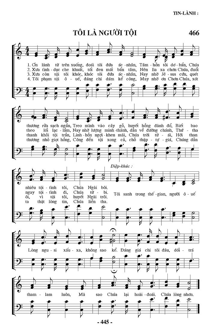1. Ơn lành từ trên xuống, đoái tôi đứa ác nhân, Tâm hồn tôi dơ bẩn, Chúa thương rửa sạch ngần, Treo mình vào cây gỗ, huyết hồng đành đổ, Biết bao tham lam luôn, Mà sao Chúa lại hoài đoái. Chúa lòng nhơn. 2. Xưa tình dục che khuất, tối đen mất bẩn tâm, Nên lìa xa chơn Chúa, đuổi theo lối lạc lầm, Nay nhờ lượng minh thánh, dẫn về đường chánh, Thứ tha tham lam luôn, Mà sao Chúa lại hoài đoái. Chúa lòng nhơn. 3. Xưa còn tội tôi khóc, khóc tôi đứa ác nhân, Nay nhờ Jêsus cứu, quét thanh khỏi tội trần, Linh hồn ngợi khen mãi, Chúa trời từ ái, Hơi than tham lam luôn, Mà sao Chúa lại hoài đoái. Chúa lòng nhơn. 4. Tôi phạm tội ô uế, đáng chỉ dám kể công, May nhờ ơn Chơn Chúa, xót thương nhỏ giọt hồng, Công đền tội xong cả, chỗ thập tự giá, Chúng dẫn tham lam luôn, Mà sao Chúa lại hoài đoái. Chúa lòng nhơn. Điệp khúc: Nhiêu tội tình tôi, Chúa Ngài bôi. Ngay tội tình đi, Chúa từ bi. Tôi sanh trong thế gian, người ô uế ôi, vì tội tôi, huyết Ngài trôi. Ta thật lòng tin, Chúa liền tha. Lòng ngu si xấu xa, không sao kể. Đáng giá chi tôi đâu, dối trá
