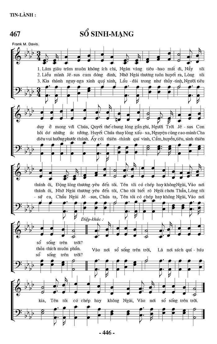 1. Làm giàu trăm muôn không ích chi, Ngàn vàng tiêu hao mất đi, Nầy tôi duy ở mong với Chúa, Quyết thế chung lòng gắn ghi, Người Trời Jê-sus Con thánh ôi, Động lòng thương yêu đến tôi. Tên tôi có chép hay không Ngài, Vào nơi sổ sống trên trời? 2. Liều mình Jê-sus cam đóng đinh, Nhờ Ngài thương tuôn huyết ra, Lòng tôi hôi dơ những ác tương. Huyết Chúa thay lòng xấu xa, Nguyện cùng cao-minh Cha thánh ôi, Nhờ Ngài thương yêu đến tôi, Cho tôi biết rõ Ngôi chơn Thần, Lòng tôi thỏa thích muôn phần. 3. Kìa thành nguy-nga xinh quá xinh, Lầu đài trong như thủy tinh, Người tiêu diêu vui hưởng phước thánh. Ấy cõi thiên thành quí vinh, Cầm, huyền, tiêu, sinh thiên sứ ca, Chầu Ngài Jê-sus, Chúa ta, Tên tôi có chép hay không Ngài, Vào nơi sổ sống trên trời. Điệp khúc: sổ sống trên trời? Vào nơi sổ sống trên trời, Là nơi sách quí báu kia, Tên tôi có chép hay không Ngài, Vào nơi sổ sống trên trời.
