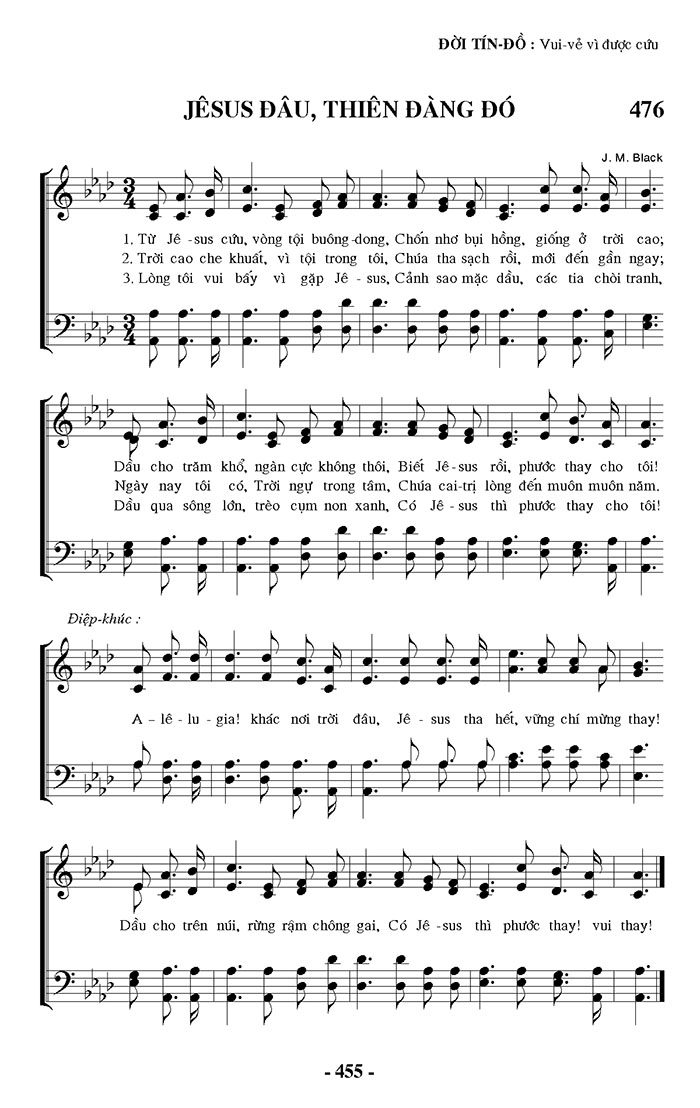 1. Từ Jê-sus cứu, vòng tội buông dong, Chốn nhơ bụi hồng, giống ở trời cao; Dầu cho trăm khổ, ngàn cực không thôi, Biết Jê-sus rồi, phước thay cho tôi! 2. Trời cao che khuất, vì tội trong tôi, Chúa tha sạch rồi, mới đến gần ngay; Ngày nay tôi có, Trời ngự trong tâm, Chúa cai trị lòng đến muôn muôn năm. 3. Lòng tôi vui bấy vì gặp Jê-sus, Cảnh sao mặc dầu, các tia chòi tranh, Dầu qua sông lớn, trèo cụm non xanh, Có Jê-sus thì phước thay cho tôi! Điệp khúc: A lê-lu-gia! khác nơi trời đầu, Jê-sus tha hết, vững chí mừng thay! Dầu cho trên núi, rừng rậm chông gai, Có Jê-sus thì phước thay! vui thay!