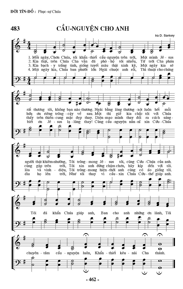 1. Mỗi ngày, Chơn Chúa, tôi khẩn thiết cầu nguyện trên trời, Một mình Jê-sus rất thương tôi, không bạn nào thương. Ngài bằng lòng thương-xót luôn hết mỗi người thật khiêm nhường, Tôi trông-mong Jê-sus tôi, Tôi đã khẩn Chúa giúp anh, Ban cho anh những ơn lành, Tôi chuyên-tâm cầu-nguyện luôn, Khẩn-thiết kêu-nài Cha thánh. 2. Kìa thật, trên Chúa Cha vẫn đã phò-hộ tôi nhiều, Từ trời Cha phán hứa ơn riêng trông-cậy về sau. Một thì giờ kia chắc tôi với Chúa cùng gặp trên trời, Tôi xin anh đừng chậm chơn, hãy kíp đến với tôi. 3. Kìa bạch y trắng tinh, giống tuyết màu thật xinh kỳ, Một ngày kia sẽ thấy trên thiên-cung mặc đẹp thay. Diện-mạo mình thay đổi ra cách sáng-lòa và vinh-diệu, Tôi trông-mong hiện-thời anh cũng có áo giống tôi. 4. Một ngày kia, Chúa ban phước lớn Ngài chuộc anh rỗi, Thì thuật cho chúng biết ơn Jê-sus lạ-lùng thay! Cùng cầu-nguyện năn-nỉ xin Cứu-Chúa dìu họ lên trời, Như tôi thay vì cầu-xin Chúa Cứu-thế giúp anh.