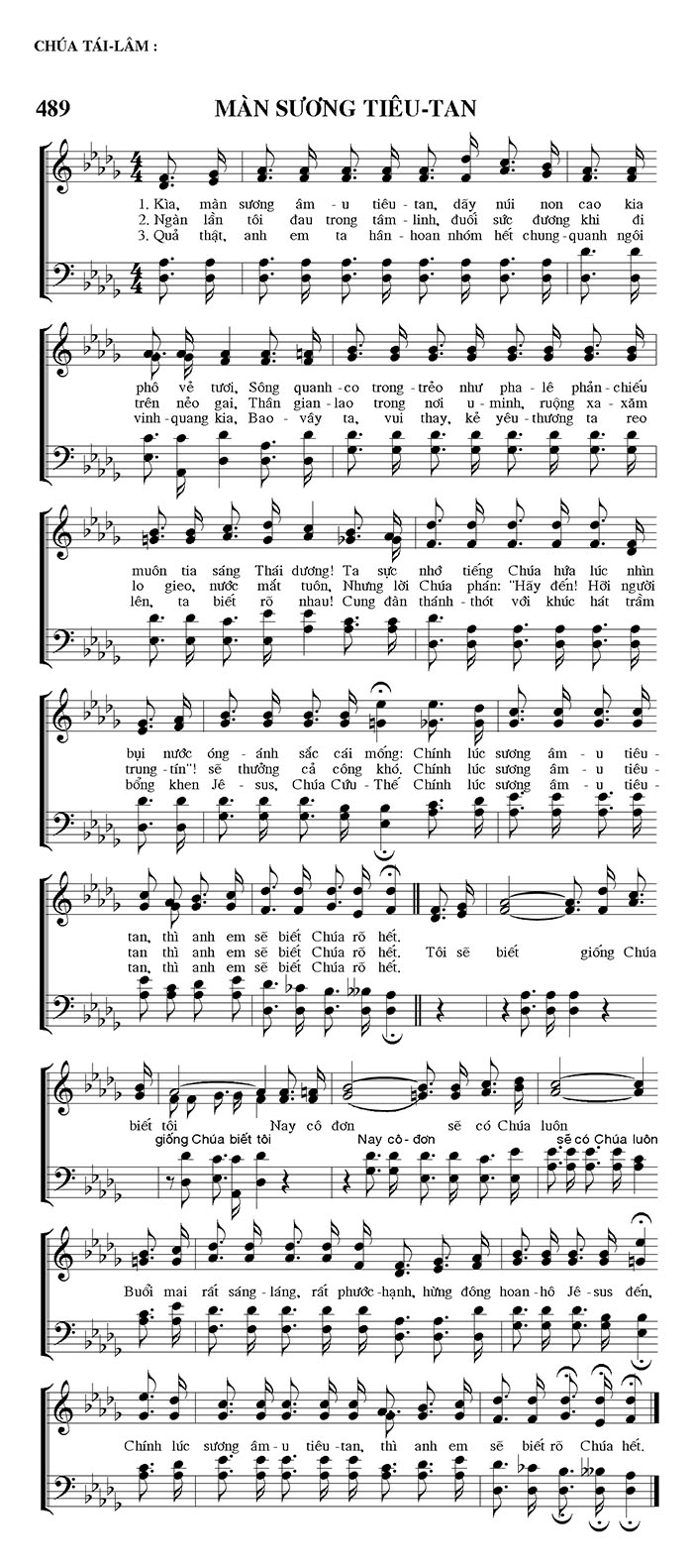 1. Kìa, màn sương âm u tiêu tan, dãy núi non cao kia phô vẻ tươi, Sông quanh co trong trẻo như pha lê phản chiếu muôn tia sáng Thái dương! Ta sực nhớ tiếng Chúa hứa lúc nhìn bụi nước óng ánh sắc cái mống: Chính lúc sương âm u tiêu tan, thì anh em sẽ biết Chúa rõ hết. 2. Ngàn lần tôi đau trong tâm linh, đuối sức đương khi đi trên nẻo gai, Thân gian lao trong nơi u minh, ruộng xa xăm lo gieo, nước mắt tuôn, Nhưng lời Chúa phán: "Hãy đến! Hỡi người trung tín"! sẽ thưởng cả công khó. Chính lúc sương âm u tiêu tan, thì anh em sẽ biết Chúa rõ hết. 3. Quả thật, anh em ta hân hoan nhóm hết chung quanh ngôi vinh-quang kia, Bao vây ta, vui thay, kẻ yêu thương ta reo lên, ta biết rõ nhau! Cung đàn thánh thót với khúc hát trầm bổng khen Jê-sus, Chúa Cứu-Thế Chính lúc sương âm u tiêu tan, thì anh em sẽ biết Chúa rõ hết. Điệp khúc: Tôi sẽ biết giống Chúa biết tôi. Nay cô đơn sẽ có Chúa luôn. Nay cô đơn sẽ có Chúa luôn. Buổi mai rất sáng láng, rất phước hạnh, hừng đông hoan hô Jê-sus đến, Chính lúc sương âm u tiêu tan, thì anh em sẽ biết rõ Chúa hết.