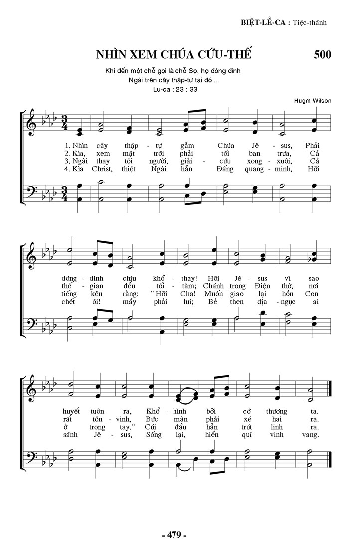 1. Nhìn cây thập tự gẫm Chúa Jê-sus, Phải đóng đinh chịu khổ thay! Hỡi Jê-sus vì sao huyết tuôn ra, Khổ hình bởi cơ thương ta. 2. Kìa, xem mặt trời phải tối ban trưa, Cả thế gian đều tối tăm; Chánh trong Điện thờ, nơi rất tôn vinh, Bức màn phải xé hai ra. 3. Ngài thay tội người, giải cứu xong xuôi, Cả tiếng kêu rằng: "Hỡi Cha! Muốn giao lại hồn Con ở trong tay." Cúi đầu hẳn trút linh ra. 4. Kìa Christ, thiệt Ngài hẳn Đấng quang minh, Hỡi chết ôi! mầy phải lui; Bẻ then địa-ngục ai sánh Jê-sus, Sống lại, hiển quí vinh vang.
