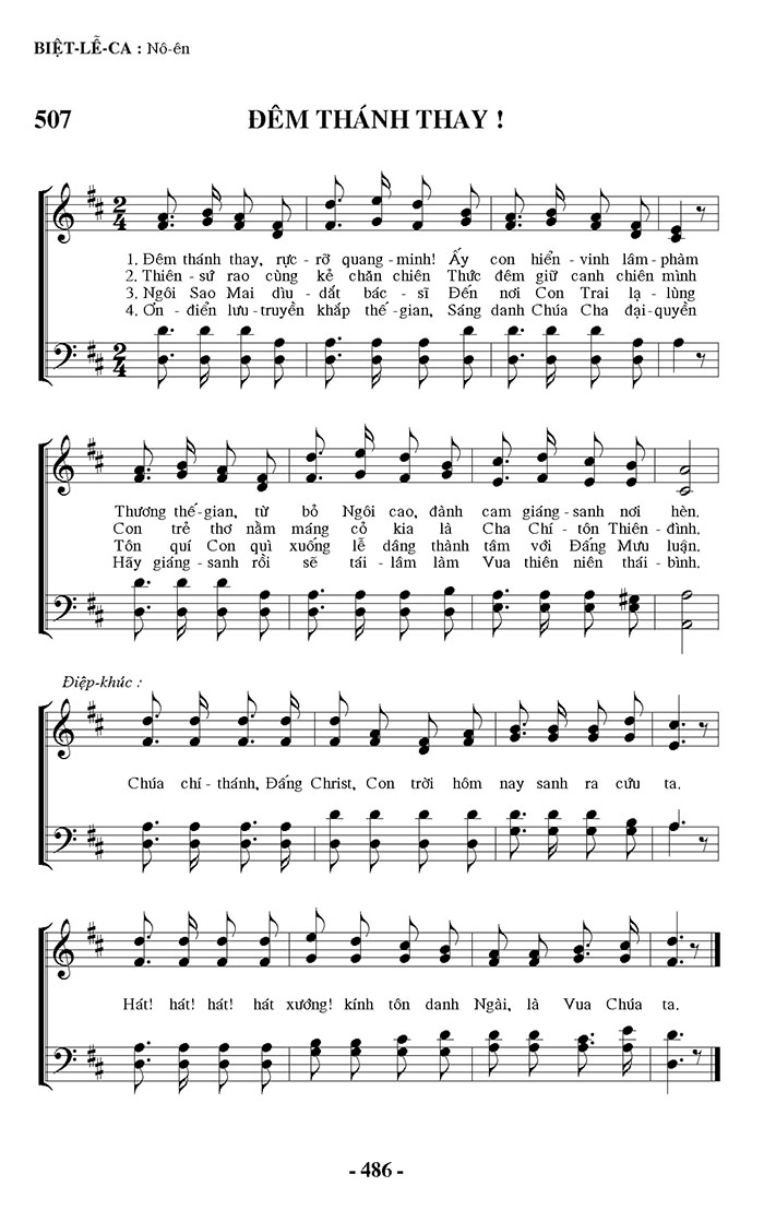 1. Đêm thánh thay, rực - rỡ quang - minh! Ấy con hiển - vinh lâm - phàm Thương thế gian, từ bỏ Ngôi cao, đành cam giáng - sanh nơi hèn. 2. Thiên - sứ rao cùng kẻ chăn chiên Thức đêm giữ canh chiên mình Con trẻ thơ nằm máng cỏ kia là Cha Chí - tôn Thiên - đình, 3. Ngôi Sao Mai dìu - dắt bác - sĩ Đến nơi Con Trai lạ - lùng Tôn quí Con quì xuống lễ dâng thành tâm với Đấng Mưu luận. 4. Ơn - điển lưu - truyền khắp thế - gian, Sáng danh Chúa Cha đại - quyền Hãy giáng - sanh rồi sẽ tái - lâm làm Vua thiên niên thái - bình. Điệp khúc: Chúa chí - thánh, Đấng Christ, Con trời hôm nay sanh ra cứu ta. Hát! hát! hát! hát xướng! kính tôn danh Ngài, là Vua Chúa ta.