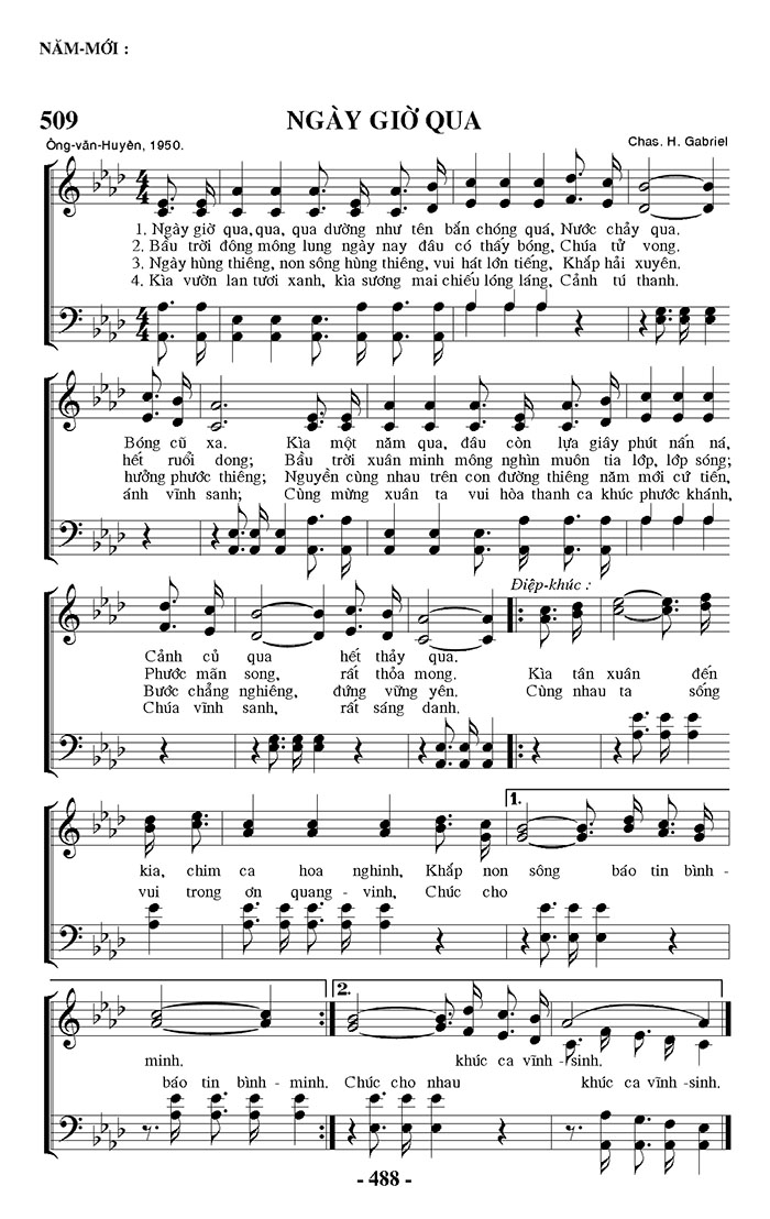 1. Ngày giờ qua, qua, qua dường như tên bắn chóng quá, Nước chảy qua. Bóng cũ xa. Kìa một năm qua, đâu còn lựa giây phút nấn ná, kia, chim ca hoa nghinh, Khắp non sông báo tin bình - minh. 2. Bầu trời đông mông lung ngày nay đâu có thấy bóng, Chúa tử vong. hết ruổi dong; Bầu trời xuân mình mông nghìn muôn tia lớp, lớp sóng, vui trong ơn quang vinh, Chúc cho khúc ca vĩnh -sinh. 3. Ngày hùng thiêng, non sông hùng thiêng, vui hát lớn tiếng, Khắp hải xuyên. hưởng phước thiêng; Nguyễn cùng nhau trên con đường thiêng năm mới cứ tiên, báo tin bình minh. Chúc cho nhau khúc ca vĩnh -sinh. 4. Kìa vườn lan tươi xanh, kìa sương mai chiếu lóng láng, Cảnh tú thanh. ánh vĩnh sanh; Cùng mừng xuân ta vui hòa thanh ca khúc phước khánh, Điệp khúc: Cảnh cũ qua hết thảy qua. Phước mãn song, rất thỏa mong. Bước chẳng nghiêng, đứng vững yên. Chúa vĩnh sanh, rất sáng danh, Kìa tân xuân đến Cùng nhau ta sống