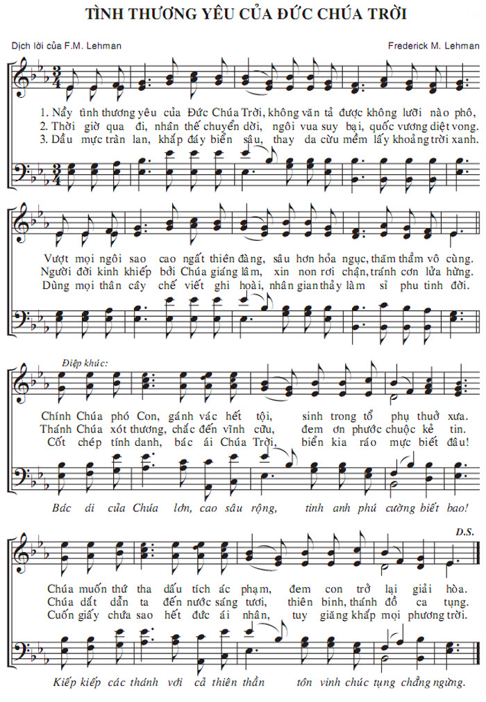 1. Nầy tình thương yêu của Đức Chúa Trời, không văn tả được không lưỡi nào phô, Vượt mọi ngôi sao cao ngất thiên đàng, sâu hơn hỏa ngục, thăm thẳm vô cùng. Chúa muốn thứ tha dấu tích ác phạm, đem con trở lại giải hòa. Kiếp kiếp các thánh với cả thiên thần tôn vinh chúc tụng chẳng ngừng. 2. Thời giờ qua đi, nhân thế chuyển dời, ngôi vua suy bại, quốc vương diệt vong. Người đời kinh khiếp bởi Chúa giáng lâm, xin non rơi chận, tránh cơn lửa hừng. Chúa dắt dẫn ta đến nước sáng tươi, thiên binh, thánh đồ ca tụng. Kiếp kiếp các thánh với cả thiên thần tôn vinh chúc tụng chẳng ngừng. 3. Dầu mực tràn lan, khắp đáy biển sâu, thay da cừu mềm lấy khoảng trời xanh. Dùng mọi thân cây chế viết ghi hoài, nhân gian thảy làm sỉ phu tỉnh đời. Cuốn giấy chứa sao hết đức ái nhân, tuy giăng khắp mọi phương trời. Kiếp kiếp các thánh với cả thiên thần tôn vinh chúc tụng chẳng ngừng. Điệp khúc: Chính Chúa phó Con, gánh vác hết tội, sinh trong tổ phụ thuở xưa. Thánh Chúa xót thương, chắc đến vĩnh cữu, đem ơn phước chuộc kẻ tin. Cốt chép tính danh, bác ái Chúa Trời, biển kia ráo mực biết đâu! Bác ái của Chúa lớn, cao sâu rộng, tình anh phú cường biết bao!