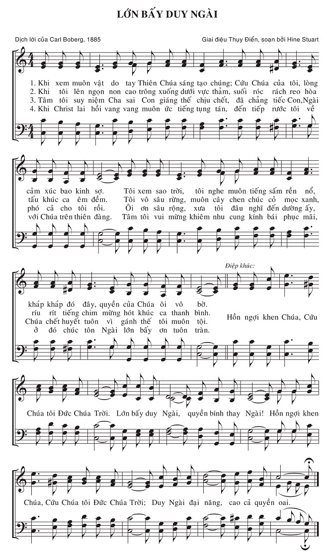 1. Khi xem muôn vật do tay Thiên Chúa sáng tạo chúng; Cứu Chúa của tôi, lòng cảm xúc bao kinh sợ. Tôi xem sao trời, tôi nghe muôn tiếng sấm rền nổ, kháp kháp đó đây, quyền của Chúa ôi vô bờ. 2. Khi tôi lên ngọn non cao trông xuống dưới vực thẳm, suối róc rách reo hòa tấu khúc ca êm đềm. Tôi vô sâu rừng, muôn cây chen chúc cỏ mọc xanh, ríu rít tiếng chim mừng hót khúc ca thanh bình. 3. Tâm tôi suy niệm Cha sai Con giáng thế chịu chết, đã chẳng tiếc Con, Ngài phó cả cho tôi rồi. Ôi ơn sâu rộng, xưa tôi đâu nghĩ đến dường ấy, Chúa chết huyết tuôn vì gánh thế tôi muôn tội. 4. Khi Christ lai hồi vang vang muôn ức tiếng tụng tán, đến tiếp rước tôi về với Chúa trên thiên đàng. Tâm tôi vui mừng khiêm nhu cung kính bái phục mãi, ở đó chúc tôn Ngài lớn bấy ơn tuôn tràn. Điệp khúc: Hồn ngợi khen Chúa, Cứu Chúa tôi Đức Chúa Trời. Lớn bấy duy Ngài, quyền bính thay Ngài! Hồn ngợi khen Chúa, Cứu Chúa tôi Đức Chúa Trời; Duy Ngài đại năng, cao cả quyền oai.
