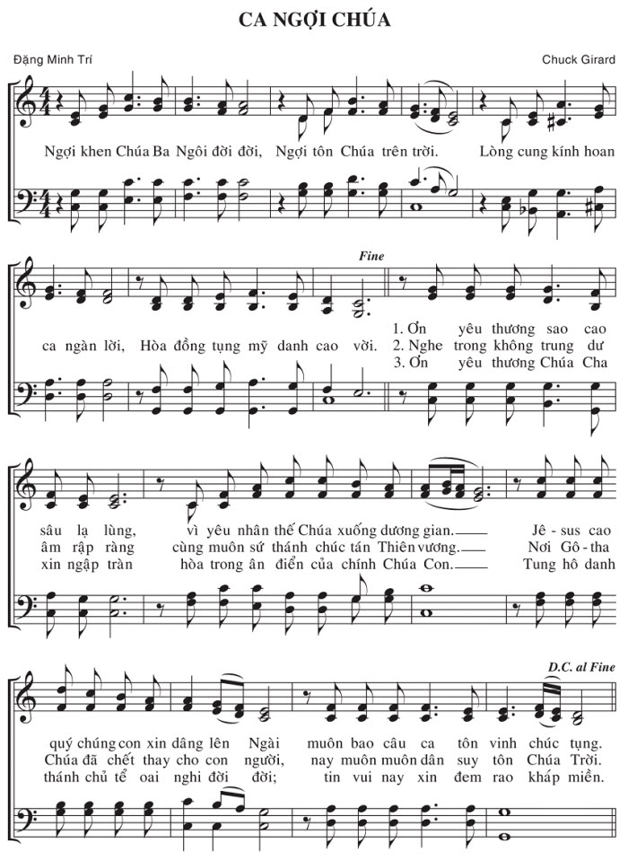 1. Ngợi khen Chúa Ba Ngôi đời đời, Ngợi tôn Chúa trên trời. Lòng cung kính hoan ca ngàn lời, Hòa đồng tụng mỹ danh cao vời. Ơn yêu thương sao cao sâu lạ lùng, vì yêu nhân thế Chúa xuống dương gian. Jê-sus cao quý chúng con xin dâng lên Ngài muôn bao câu ca tôn vinh chúc tụng. 2. Ngợi khen Chúa Ba Ngôi đời đời, Ngợi tôn Chúa trên trời. Lòng cung kính hoan ca ngàn lời, Hòa đồng tụng mỹ danh cao vời. Nghe trong không trung dư âm rập ràng cùng muôn sứ thánh chúc tán Thiên vương. Nơi Gô-tha Chúa đã chết thay cho con người, nay muôn muôn dân suy tôn Chúa Trời. 3. Ngợi khen Chúa Ba Ngôi đời đời, Ngợi tôn Chúa trên trời. Lòng cung kính hoan ca ngàn lời, Hòa đồng tụng mỹ danh cao vời. Ơn yêu thương Chúa Cha xin ngập tràn hòa trong ân điển của chính Chúa Con. Tung hô danh thánh chủ tể oai nghi đời đời; tin vui nay xin đem rao khắp miền.