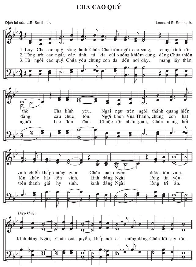 1. Lạy Cha cao quý, sáng danh Chúa Cha trên ngôi cao sang, cung kính tôn thờ Cha kính yêu. Ngài ngự trên ngôi thánh quang hiển vinh chiếu khắp dương gian; Chúa oai quyền, được tôn vinh. 2. Từng trời cao ngất, các tinh tú kia cúi xuống khiêm cung, dâng Chúa thiên đàng câu chúc tôn. Ngợi khen Vua Thánh, chúng con hát lên khúc hát tôn vinh, kính dâng Ngài lòng tin yêu. 3. Từ ngôi cao quý, Chúa yêu chúng con đã đến nơi đây, mang lấy thân người bao đớn đau. Chuộc tội nhân gian, Chúa mang hết trên thánh giá hy sinh, kính dâng Ngài lòng tri ân. Điệp khúc: Kính dâng Ngài, Chúa oai quyền, khắp nơi ca mừng dâng Chúa lời suy tôn.