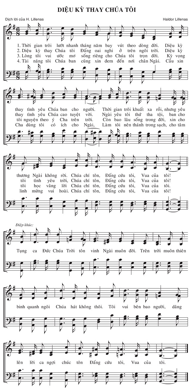 1. Thời gian trôi lướt nhanh tháng năm bay vút theo dòng đời. Diệu kỳ thay tình yêu Chúa ban cho người. Thời gian trôi khuất xa rồi, nhưng yêu thương Ngài không rời. Chúa chí tôn, Đấng cứu tôi, Vua của tôi! 2. Diệu kỳ thay Chúa tôi Đấng oai nghi ở trên ngôi trời. Diệu kỳ thay tình yêu Chúa cao tuyệt vời. Ngài yêu tôi thứ tha tội, ban cho tôi tình yêu trời. Chúa chí tôn, Đấng cứu tôi, Vua của tôi! 3. Lòng tôi vui ước mơ sống riêng cho Chúa tôi trọn đời. Kỳ vọng tôi nguyện theo ý Cha trên trời. Còn bao lâu sống trong đời, xin cho tôi học vâng lời Chúa chí tôn, Đấng cứu tôi, Vua của tôi. 4. Tài năng tôi Chúa ban, tôi cũng xin đem đến nơi chân Ngài. Cầu xin Cha dùng tôi có ích cho Ngài, Làm tôi nên thánh trong sạch, cho tâm linh mừng vui hoài. Chúa chí tôn, Đấng cứu tôi, Vua của tôi! Điệp khúc: Tụng ca Đức Chúa Trời tôn vinh Ngài muôn đời. Trên trời muôn thiên binh quanh ngôi Chúa hát không thôi. Tôi vui bên bao người, dâng lên lời ca ngợi chúc tôn Đấng cứu tôi, Vua của tôi.