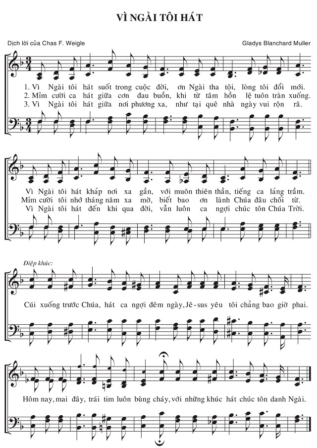 1. Vì Ngài tôi hát suốt trong cuộc đời, ơn Ngài tha tội, lòng tôi đổi mới. Vì Ngài tôi hát khắp nơi xa gần, với muôn thiên thần, tiếng ca láng trầm. 2. Mỉm cười ca hát giữa cơn đau buồn, khi từ tâm hồn lệ tuôn tràn xuống. Mỉm cười tôi nhớ tháng năm xa mờ, biết bao ơn lành Chúa đâu chối từ. 3. Vì Ngài tôi hát giữa nơi phương xa, như tại quê nhà ngày vui rộn rã. Vì Ngài tôi hát đến khi qua đời, vẫn luôn ca ngợi chúc tôn Chúa Trời. Điệp khúc: Cúi xuống trước Chúa, hát ca ngợi đêm ngày, Jê-sus yêu tôi chẳng bao giờ phai. Hôm nay, mai đây, trái tim luôn bùng cháy, với những khúc hát chúc tôn danh Ngài.