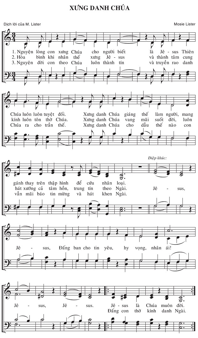 1. Nguyện lòng con xưng Chúa cho người biết là Jê-sus Thiên Chúa luôn luôn tuyệt đối. Xưng danh Chúa giáng thế làm người, mang gánh thay trên thập hình để cứu nhân loại. 2. Hòa bình khi nhân thế xưng Jê-sus và thành tâm cung kính luôn tôn thờ Chúa. Xưng danh Chúa vang mãi suốt đời, luôn hát xướng cả tâm hồn, trung tín theo Ngài. 3. Nguyện đời con theo Chúa luôn thành tín Chúa ra cho trần thế. Xưng danh Chúa cho dẫu thế nào con vẫn mãi báo tin mừng và hát khen Ngài. Điệp khúc: Jê-sus, Jê-sus, Đấng ban cho tin yêu, hy vọng, nhân ái! Jê-sus, Jê-sus, Jê-sus là Chúa muôn đời. Đấng con thờ kính danh Ngài.