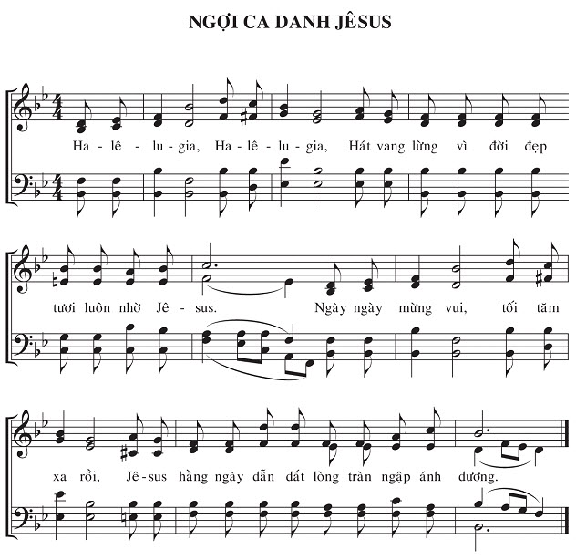 1. Ha-lê-lu-gia, Ha-lê-lu-gia, Hát vang lừng vì đời đẹp tươi luôn nhờ Jê-sus. Ngày ngày mừng vui, tối tăm xa rồi, Jê-sus hàng ngày dẫn dắt lòng tràn ngập ánh dương.