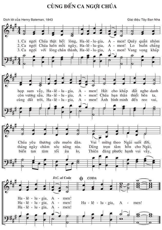 1. Ca ngợi Chúa thật hết lòng, Ha-lê-lu-gia, A - men! Quây quần nhóm họp sum vầy, Ha-lê-lu-gia, A - men! Hát cho khắp đất nghe danh Chúa yêu thương cứu muôn dân. Vui mừng theo Ngài suốt đời, Ha-lê-lu-gia, A - men! 2. Ca ngợi Chúa luôn mỗi ngày, Ha-lê-lu-gia, A - men! Lo buồn chẳng còn vương sầu, Ha-lê-lu-gia, A - men! Chúa bạn thân thiết bên ta, tháng ngày chăm sóc nâng niu. Dâng trọn tâm hồn cho Ngài, Ha-lê-lu-gia, A - men! 3. Ca ngợi với lòng chân thành, Ha-lê-lu-gia, A - men! Vang vọng khắp cùng đất trời, Ha-lê-lu-gia, A - men! Ánh bình minh đến reo vui, biến tan tăm tối âu lo, Thiên đàng phước hạnh vui vầy, Ha-lê-lu-gia, A - men! Điệp khúc: Ha-lê-lu-gia, A - men! Ha-lê-lu-gia, A - men!