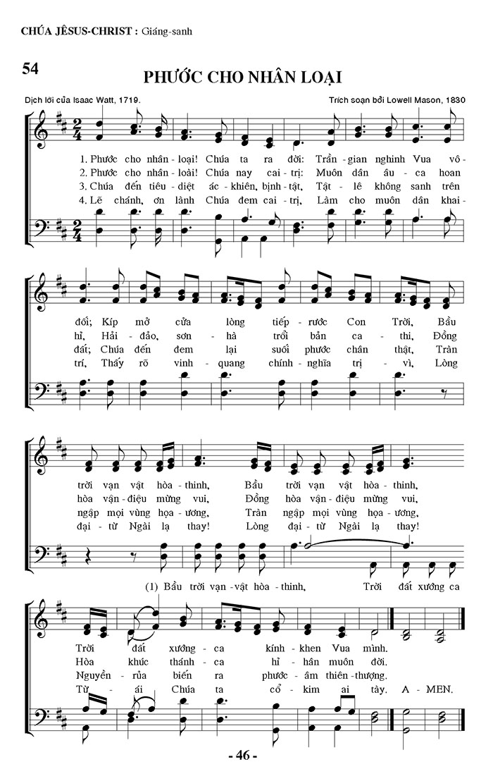 1. Phước cho nhân loại! Chúa ta ra đời: Trần gian nghinh Vua vô đối; Kíp mở cửa lòng tiếp rước Con Trời, Bầu trời vạn vật hòa thinh, hòa vận - điệu mừng vui, ngập mọi vùng họa - ương, đại - từ Ngài lạ thay! 2. Phước cho nhân - loài! Chúa nay cai trị: Muôn dân âu ca hoan hỉ, Hải đảo, sơn hà trổi bản ca thi, Đồng hòa vận - điệu mừng vui, ngập mọi vùng họa - ương, đại - từ Ngài lạ thay! 3. Chúa đến tiêu - diệt ác khiên, bịnh - tật, Tật - lê không sanh trên đất; Chúa đến dem suối phước chân thật, Tràn ngập mọi vùng họa - ương, đại - từ Ngài lạ thay! 4. Lẽ chánh, ơn lành Chúa đem cai - trị, Làm cho muôn dân khai - trí, Thấy rõ vinh - quang chính - nghĩa tri vì, Lòng đại - từ Ngài lạ thay! Điệp khúc: (1) Bầu trời vạn - vật hòa - thinh, Trời đất xướng ca kính khen Vua mình, Hòa khúc thánh - ca hỉ - hân muôn đời. Nguyễn rủa biến ra phước - ấm thiên - thượng. Từ - ái Chúa ta cố - kim ai tày. A - MEN.