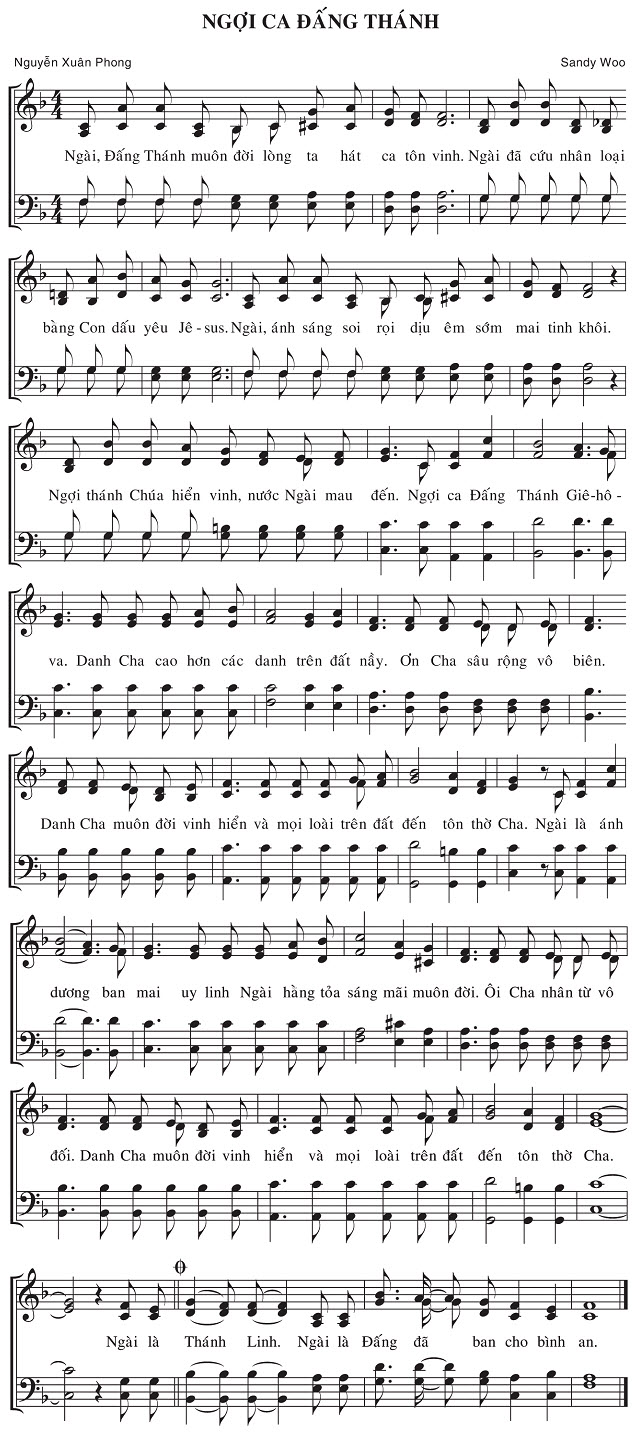 1. Ngài, Đấng Thánh muôn đời lòng ta hát ca tôn vinh. Ngài đã cứu nhân loại bằng Con dấu yêu Jê-sus. Ngài, ánh sáng soi rọi dịu êm sớm mai tinh khôi. Ngợi thánh Chúa hiển vinh, nước Ngài mau đến. Ngợi ca Đấng Thánh Giê-hô-va. Danh Cha cao hơn các danh trên đất nầy. Ơn Cha sâu rộng vô biên. Danh Cha muôn đời vinh hiển và mọi loài trên đất đến tôn thờ Cha. Ngài là ánh dương ban mai uy linh Ngài hằng tỏa sáng mãi muôn đời. Ôi Cha nhân từ vô đối. Danh Cha muôn đời vinh hiển và mọi loài trên đất đến tôn thờ Cha. Ngài là Thánh Linh. Ngài là Đấng đã ban cho bình an.