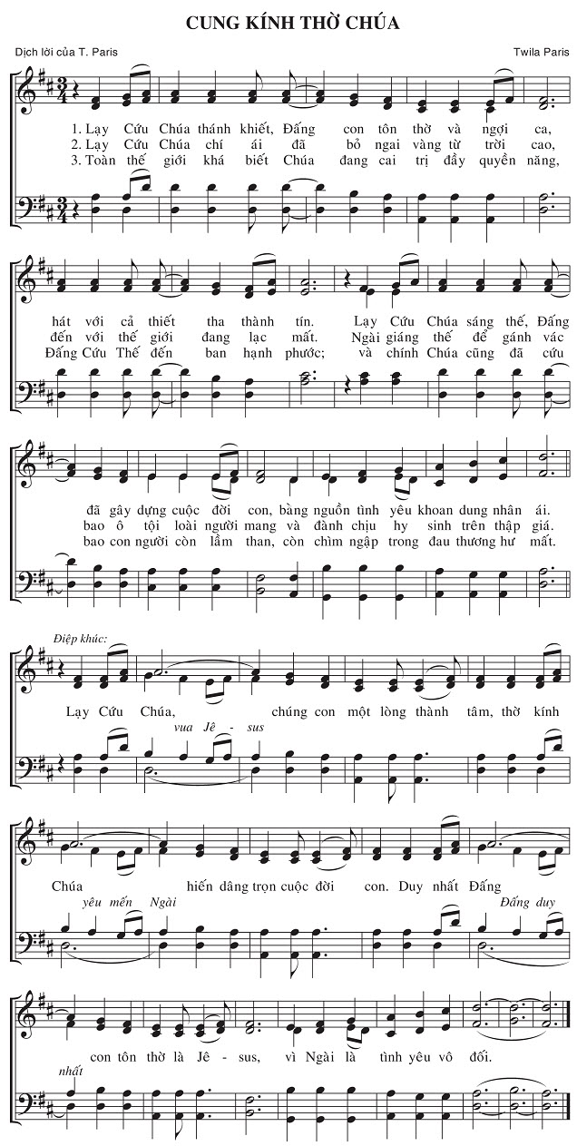 1. Lạy Cứu Chúa thánh khiết, Đấng con tôn thờ và ngợi ca, hát với cả thiết tha thành tín. Lạy Cứu Chúa sáng thế, Đấng đã gây dựng cuộc đời con, bằng nguồn tình yêu khoan dung nhân ái. 2. Lạy Cứu Chúa chí ái đã bỏ ngai vàng từ trời cao, đến với thế giới đang lạc mất. Ngài giáng thế để gánh vác bao ô tội loài người mang và đành chịu hy sinh trên thập giá. 3. Toàn thế giới khá biết Chúa đang cai trị đầy quyền năng, Đấng Cứu Thế đến ban hạnh phước; và chính Chúa cũng đã cứu bao con người còn lầm than, còn chìm ngập trong đau thương hư mất. Điệp khúc: Lạy Cứu Chúa, chúng con một lòng thành tâm, thờ kính vua Jê-sus. Chúa hiến dâng trọn cuộc đời con. Duy nhất Đấng yêu mến Ngài. Đấng duy nhất con tôn thờ là Jê-sus, vì Ngài là tình yêu vô đối.