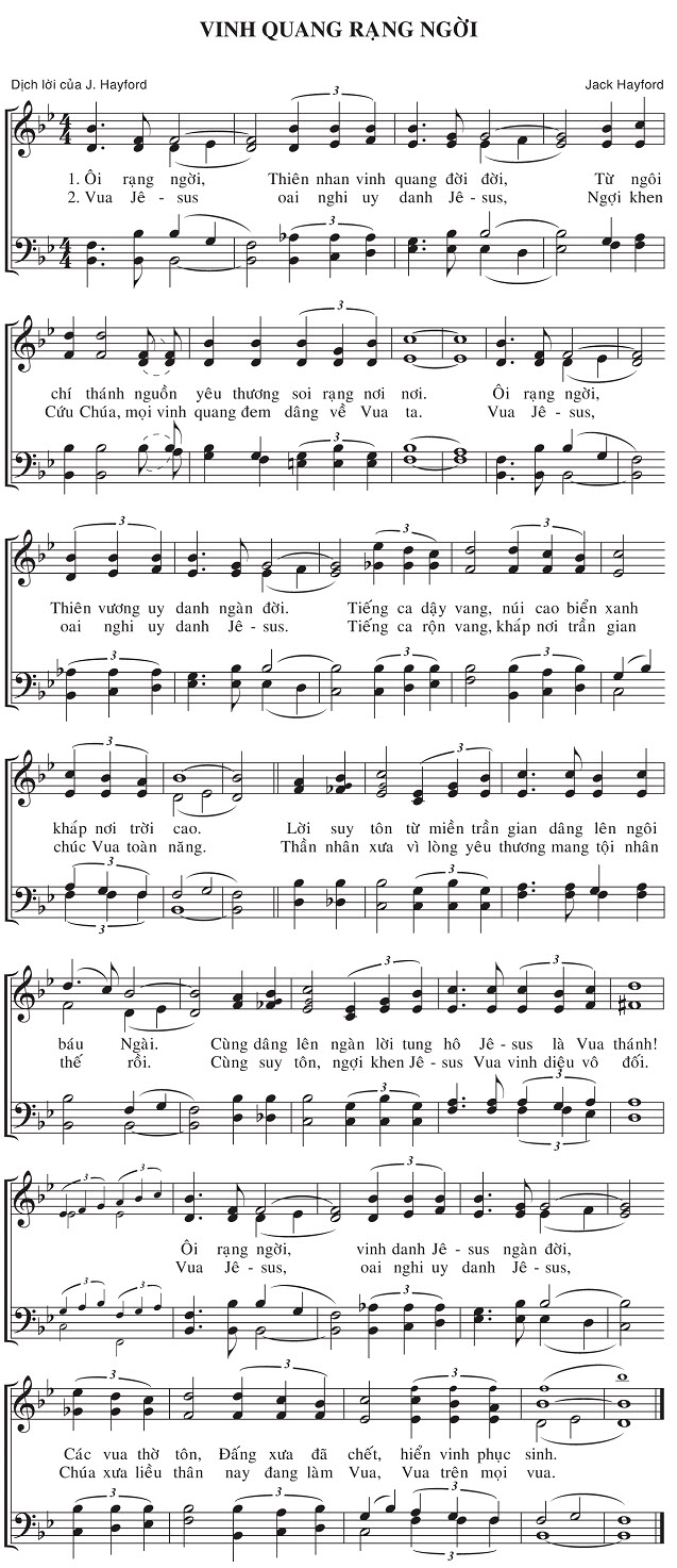 1. Ôi rạng ngời, Thiên nhan vinh quang đời đời, Từ ngôi chí thánh nguồn yêu thương soi rạng nơi nơi. Tiếng ca dậy vang, núi cao biển xanh khắp nơi trời cao. Lời suy tôn từ miền trần gian dâng lên ngôi báu Ngài. Cùng dâng lên ngàn lời tung hô Jêsus là Vua thánh! Ôi rạng ngời, vinh danh Jê sus ngàn đời, Các vua thờ tôn, Đấng xưa đã chết, hiển vinh phục sinh. 2. Vua Jê sus oai nghi uy danh Jê sus, Ngợi khen Cứu Chúa, mọi vinh quang đem dâng về Vua ta. Tiếng ca rộn vang, khắp nơi trần gian chúc Vua toàn năng. Thần nhân xưa vì lòng yêu thương mang tội nhân thế rồi. Cùng suy tôn, ngợi khen Jê - sus Vua vinh diệu vô đối. Vua Jê sus, oai nghi uy danh Jê sus, Chúa xưa liều thân nay đang làm Vua, Vua trên mọi vua.