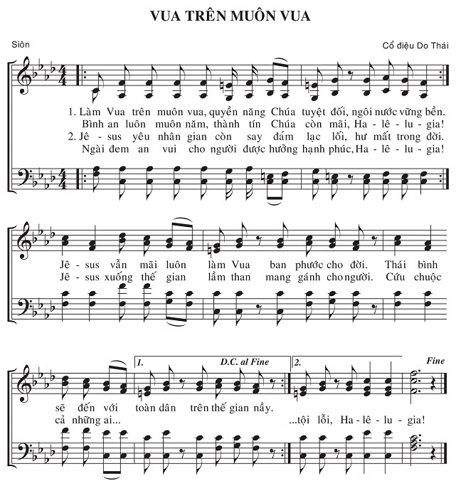 1. Làm Vua trên muôn vua, quyền năng Chúa tuyệt đối, ngôi nước vững bền. Bình an luôn muôn năm, thành tín Chúa còn mãi, Ha - lê - lu - gia! Jê - sus vẫn mãi luôn làm Vua ban phước cho đời. Thái bình sẽ đến với toàn dân trên thế gian nầy. 2. Jê - sus yêu nhân gian còn say đắm lạc lối, hư mất trong đời. Ngài đem an vui cho người được hưởng hạnh phúc, Ha - lê - lu - gia! Jê - sus xuống thế gian lầm than mang gánh cho người. Cứu chuộc cả những ai... ...tội lỗi, Ha - lê - lu - gia!