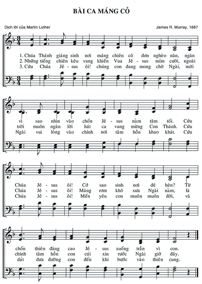 1. Chúa Thánh giáng sinh nơi máng chiên cô đơn nghèo nàn, ngàn vì sao nhìn vào chốn Jê-sus nằm tăm tối. Cứu Chúa Jê-sus ôi! Cớ sao sinh nơi đê hèn? Từ chốn thiên đàng cao Jê-sus xuống trần vì con. 2. Những tiếng chiên kêu vang khiến Vua Jê-sus mỉm cười, ngoài trời muôn ngàn lời hát ca vang mừng Con Thánh. Cứu Chúa Jê-sus ôi! Máng rơm khô xưa Ngài nằm, là chính tâm hồn con cúi xin rước Ngài giở đây. 3. Cứu Chúa Jê-sus ôi! chúng con đang mong chờ Ngài, mời Ngài vui lòng vào chính nơi tâm hồn khao khát. Cứu Chúa Jê-sus ôi! Mến yêu con muôn muôn đời, và dắt đưa đường con đến khi bước vào thiên cung.
