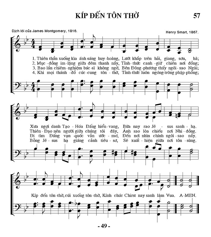 1. Thiên thần xuống kìa ánh sáng huy hoàng, Lướt khắp trên hải, giang, sơn, hà; Xưa ngợi danh Tạo - Hóa Đấng hiển-vang, Bữa nay rao Jê-sus sanh hạ. 2. Mục - đồng im lặng giữa đêm thanh nầy, Tỉnh thức canh giữ chiến nơi đồng; Thiên - Đạo nên người giữa chúng tôi đây, Ánh sao lòa chiếu nơi Nhi - đồng. 3. Bao lần chiêm nghiệm bác sĩ không ngờ, Bên Đông phương thấy ngôi sao Ngài; Đi tìm Đấng vạn quốc vẫn ước mơ, Đến nơi nhìn chính ngôi sao nầy. 4. Khi mọi thánh - đồ cúc cung tôn thờ, Tỉnh thức luôn ngóng trông phập phồng; Bỗng Jê-sus hạ giáng cảnh tiêu sơ, Sẽ xuất hiện giữa nơi tôn sùng. Điệp khúc: Kíp đến tôn thờ, cúi xuống tôn thờ, Kính chúc Chirst nay sanh làm Vua. A-MEN.