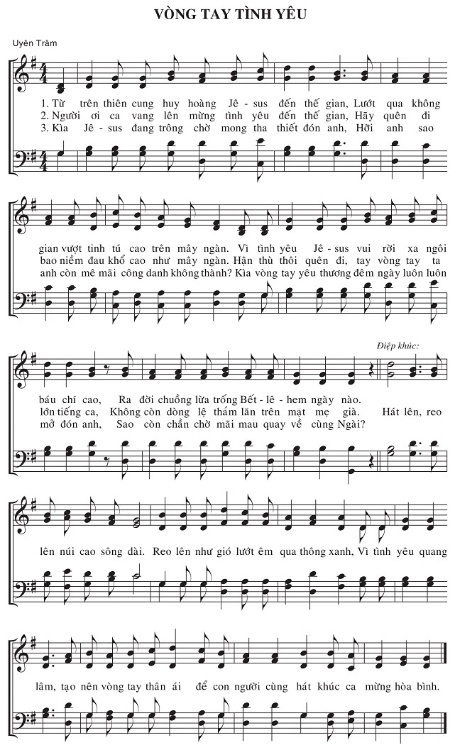 1. Từ trên thiên cung huy hoàng Jê-sus đến thế gian, Lướt qua không gian vượt tinh tú cao trên mây ngàn. Vì tình yêu Jê-sus vui rời xa ngôi báu chí cao, Ra đời chuồng lừa trống Bết-lê-hem ngày nào. 2. Người ơi ca vang lên mừng tình yêu đến thế gian, Hãy quên đi bao niềm đau khổ cao như mây ngàn. Hận thù thôi quên đi, tay vòng tay ta lớn tiếng ca, Không còn dòng lệ thắm lăn trên mặt mẹ già. 3. Kìa Jê-sus đang trông chờ mong tha thiết đón anh, Hởi anh sao anh còn mê mãi công danh không thành? Kìa vòng tay yêu thương đêm ngày luôn luôn mở đón anh, Sao còn chần chờ mãi mau quay về cùng Ngài? Điệp khúc: Hát lên, reo lên núi cao sông dài. Reo lên như gió lướt êm qua thông xanh, Vì tình yêu quang lâm, tạo nên vòng tay thân ái để con người cùng hát khúc ca mừng hòa bình.