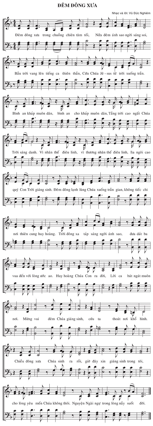1. Đêm đông xưa trong chuồng chiên tăm tối, Nửa đêm ánh sao ngời sáng soi, Bầu trời vang lên tiếng ca thiên thần, Cứu Chúa Jê-sus từ trời xuống trần. Bình an khắp muôn dân, bình an cho khắp muôn dân, Tầng trời cao ngất Chúa Trời sáng danh. Vì nhân thế điêu linh, vì thương nhân thế điêu linh, lìa ngôi cao quý Con Trời giáng sinh. Đêm đông lạnh lùng Chúa xuống trần gian, không tiếc chi nơi thiên cung huy hoàng. Trời đông xa tắp sáng ngời ánh sao, đưa dắt ba vua đến với lòng ước ao. Huy hoàng Chúa Con ra đời, Lời ca bát ngát muôn nơi. Mừng vui đêm Chúa giáng sinh, cứu ta thoát nơi khổ hình. 2. Chiều đông xưa Chúa sinh ra rồi, giờ đây xin giáng sinh trong tôi, cho lòng yêu mến Chúa không thôi. Nguyện Ngài ngự trong lòng nầy suốt đời.