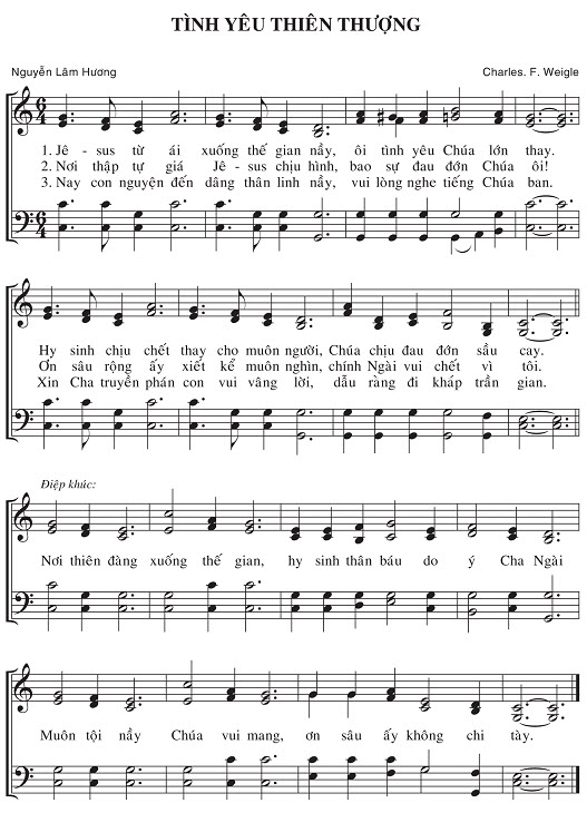 1. Jê-sus từ ái xuống thế gian nầy, ôi tình yêu Chúa lớn thay. Hy sinh chịu chết thay cho muôn người, Chúa chịu đau đớn sầu cay. 2. Nơi thập tự giá Jê-sus chịu hình, bao sự đau đớn Chúa ôi! Ơn sâu rộng ấy xiết kể muôn nghìn, chính Ngài vui chết vì tôi. 3. Nay con nguyện đến dâng thân linh nầy, vui lòng nghe tiếng Chúa ban. Xin Cha truyền phán con vui vâng lời, dẫu rằng đi khắp trần gian. Điệp khúc: Nơi thiên đàng xuống thế gian, hy sinh thân báu do ý Cha Ngài Muôn tội nầy Chúa vui mang, ơn sâu ấy không chi tày.