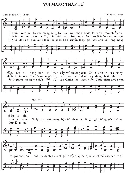 1. Nhìn xem ai đó vai mang nặng trĩu kia kìa, chân bước tó xiêu trăm chiều đau đớn. Kìa ai đang kéo lê thân đầy vết thương đau, Ôi! Chính Jê-sus mang thập tự kia. 2. Nầy con xem trán ta đây đầy vết gai đâm, hông lũng huyết tuôn nay còn ghi dấu. Nhìn xem đinh đóng xuyên tay trì tấm thân đau, cay đáng nhuốc nhơ ta chịu vì con. 3. Giờ đây con đến vâng theo lời phán Cha truyền, thập giá nay con vui lòng mang lấy. Nguyện mang cho đến khi Jê-sus Christ tái lâm, nghe Chúa phán tuyên con đẹp lòng ta. Điệp khúc: "Nẩy con vui mang thập tự theo ta, lặng nghe tiếng yêu thương ta gọi con. Vì con ta đành hy sinh gánh lấy thập hình, vui chết thế cho các con".