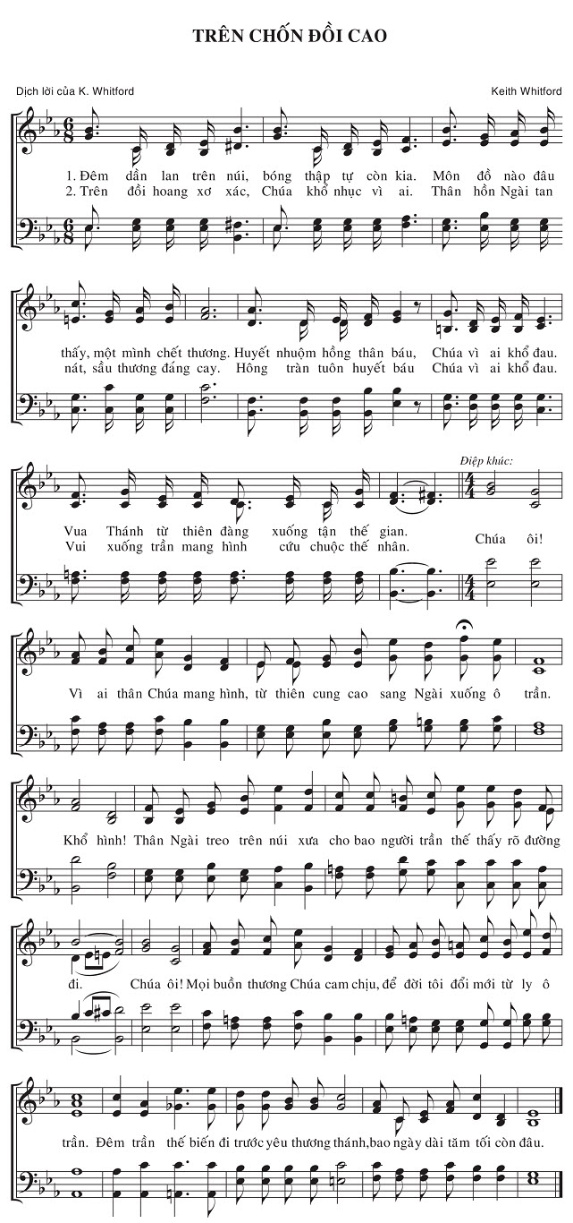 1. Đêm dần lan trên núi, bóng thập tự còn kia. Môn đồ nào đâu thấy, một mình chết thương. Huyết nhuộm hồng thân báu, Chúa vì ai khổ đau. Đêm trần thế biến đi trước yêu thương thánh, bao ngày dài tăm tối còn đâu. 2. Trên đồi hoang xơ xác, Chúa khổ nhục vì ai. Thân hồn Ngài tan nát, sầu thương đáng cay. Hồng tràn tuôn huyết báu Chúa vì ai khổ đau. Đêm trần thế biến đi trước yêu thương thánh, bao ngày dài tăm tối còn đâu. Điệp khúc: Vua Thánh từ thiên đàng xuống tận thế gian. Chúa ôi! Vui xuống trần mang hình cứu chuộc thế nhân. Vì ai thân Chúa mang hình, từ thiên cung cao sang Ngài xuống ô trần. Khổ hình! Thân Ngài treo trên núi xưa cho bao người trần thế thấy rõ đường đi. Chúa ôi! Mọi buồn thương Chúa cam chịu, để đời tôi đổi mới từ ly ô trần.