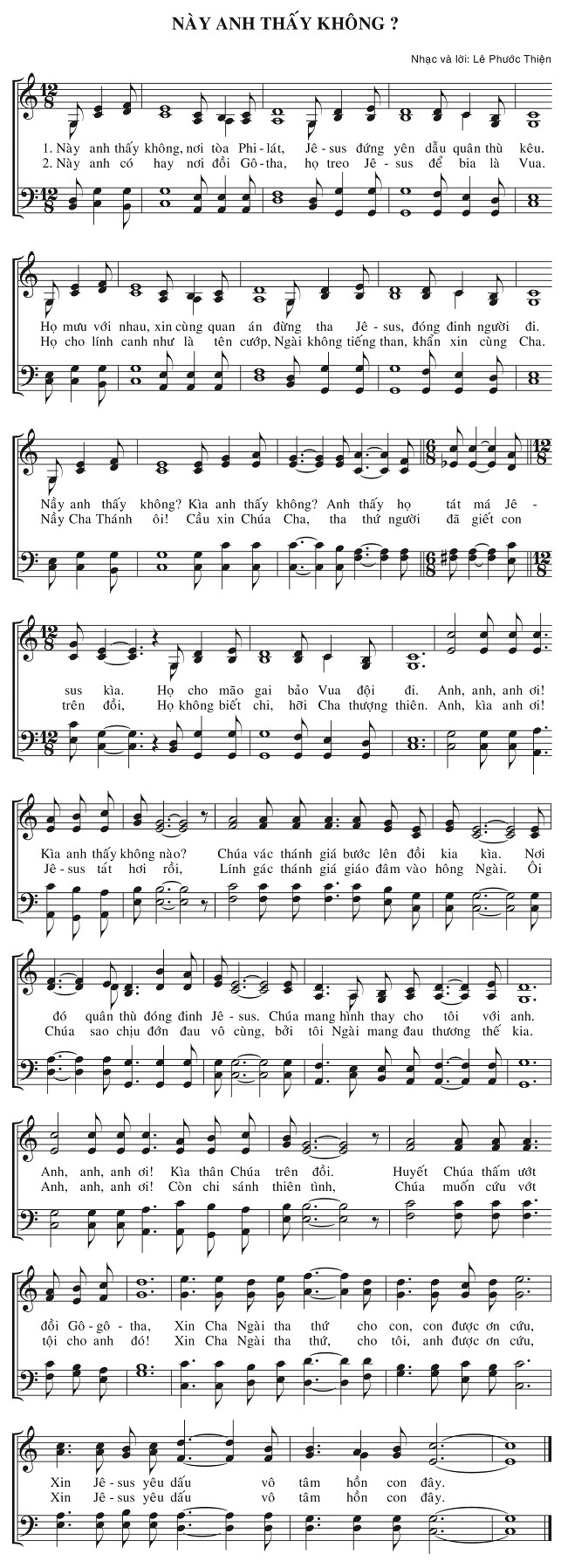1. Này anh thấy không, nơi tòa Phi - lát, Jê - sus đứng yên dẫu quân thù kêu. Họ mưu với nhau, xin cùng quan án đừng tha Jê-sus, đóng đinh người đi. Nầy anh thấy không? Kìa anh thấy không? Anh thấy họ tát má Jê-sus kìa. Họ cho mão gai bảo Vua đội đi. Anh, anh, anh ơi! Kìa anh thấy không nào? Chúa vác thánh giá bước lên đồi kia kìa. Nơi đó quân thù đóng đinh Jê-sus. Chúa mang hình thay cho tôi với anh. Anh, anh, anh ơi! Kìa thân Chúa trên đồi. Huyết Chúa thấm ướt đồi Gô - gô tha, Xin Cha Ngài tha thứ cho con, con được ơn cứu, Xin Jê-sus yêu dấu vô tâm hồn con đây. 2. Này anh có hay nơi đồi Gô-tha, họ treo Jê-sus để bia là Vua. Họ cho lính canh như là tên cướp, Ngài không tiếng than, khẩn xin cùng Cha. Nầy Cha Thánh ôi! Cầu xin Chúa Cha, tha thứ người đã giết con trên đồi, Họ không biết chi, hỡi Cha thượng thiên. Anh, kìa anh ơi! Jê-sus tắt hơi rồi, Lính gác thánh giá giáo đâm vào hông Ngài. Ôi Chúa sao chịu đớn đau vô cùng, bởi tôi Ngài mang đau thương thế kia. Anh, anh, anh ơi! Còn chi sánh thiên tình, Chúa muốn cứu vớt tôi cho anh đó! Xin Cha Ngài tha thứ, cho tôi, anh được ơn cứu, Xin Jê-sus yêu dấu vô tâm hồn con đây.