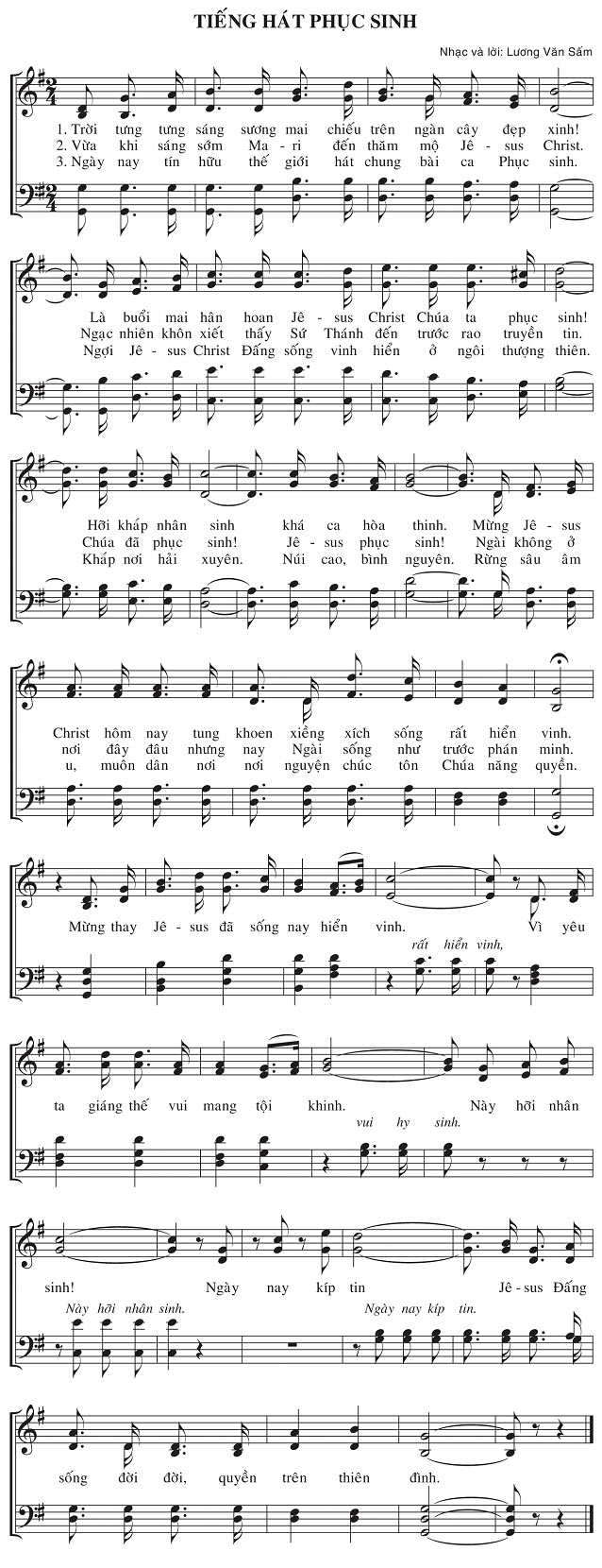 1. Trời tưng tưng sáng sương mai chiếu trên ngàn cây đẹp xinh! Là buổi mai hân hoan Jê-sus Christ Chúa ta phục sinh! Hỡi kháp nhân sinh khá ca hòa thinh. Mừng Jê-sus Christ hôm nay tung khoen xiềng xích sống rất hiển vinh. Mừng thay Jê-sus đã sống nay hiển vinh. Vì yêu ta giáng thế vui mang tội khinh. Này hỡi nhân sinh! Ngày nay kíp tin Jê-sus Đấng sống đời đời, quyền trên thiên đình. 2. Vừa khi sáng sớm Ma-ri đến thăm mộ Jê-sus Christ. Ngạc nhiên khôn xiết thấy Sứ Thánh đến trước rao truyền tin. Chúa đã phục sinh! Jê-sus phục sinh! Ngài không ở nơi đây đâu nhưng nay Ngài sống như trước phán minh. Mừng thay Jê-sus đã sống nay hiển vinh, rất hiển vinh, vui hy sinh. Này hỡi nhân sinh. Ngày nay kíp tin. Jê-sus Đấng sống đời đời, quyền trên thiên đình. 3. Ngày nay tín hữu thế giới hát chung bài ca Phục sinh. Ngợi Jê-sus Christ Đấng sống vinh hiển ở ngôi thượng thiên. Khắp nơi hải xuyên. Núi cao, bình nguyên. Rừng sâu âm u, muôn dân nơi nơi nguyện chúc tôn Chúa năng quyền. Mừng thay Jê-sus đã sống nay hiển vinh. Vì yêu ta giáng thế vui mang tội khinh. Này hỡi nhân sinh! Ngày nay kíp tin Jê-sus Đấng sống đời đời, quyền trên thiên đình.