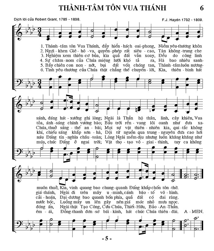 1. Thành -tâm tôn Vua Thánh, đầy hiển hách oai-phong, Niềm yêu thương khôn sánh, đáng hát - xướng ghi lòng; Ngài là Thần hộ thân, linh, cây khiên, Vua muôn thuở, Kìa, vinh quang bao chung quanh Đấng khắp chốn tôn - thờ. 2. Ngợi - khen Giê-hô-va, quyền phép rất siêu cao, Tàn không - trung che tỏa, ánh sáng chính vương bào; Bầu trời rền vang lôi oanh như đưa xa- giá-thánh, Ngài đi trên mây u-minh, cánh bão tố vô - hình. 3. Nghiệm xem thiên cơ bủa, kìa quả đất vẫn xoay, Đều do công linh Chúa, thuở sáng - thế an bài; Mọi sự vật thiên nhiên kia, qui tắc không cải - hoán, Đại dương bao quanh bốn phía, quả đất có đai ràng. 4. Sự chăm nom của Chúa miệng lưỡi khó tả ra, Hà bao nhiêu sanh- khí, chiếu sáng khắp sơn - hà, Dội từ nguồn qua trung - nguyên đưa cao hơi nước bốc, Luồng mấy un lên gây nên giá móc nhỏ mưa ngọc. 5. Bầy chiên con non nớt, bụi đất vốn chóng tan, Thành - tâm luôn nương- náu Đấng tín - nghĩa châu - toàn; Lòng Ngài mềm dịu nhưng luôn khăng khăng như đóng ấn, Ngài thật Tạo Công, Cứu Chúa, Thiết-Hữu, Bảo - An -Thần. 6. Tình yêu thương của Chúa thật chẳng thế chuyển - lời, Kìa, thiên - binh hát - múa, chúc Đấng ở ngai trời; Vật thọ tạo vô - giai thinh, tuy ca không êm ái, Đồng-thanh đơn sơ bái - kính, Hát chúc chủa thiên - đài, A - MEN.