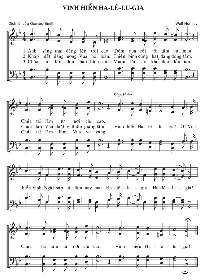 1. Ánh sáng mai dâng lên trời cao. Đêm qua rồi tối tăm vụt mau. 2. Khắp đất đang mong Vua hồi loan. Thiên binh cùng hát dâng đồng tâm. 3. Chúa tái lâm đem bao bình an. Muôn ưu sầu khổ đau đều tan. Điệp khúc: Chúa tái lâm từ nơi chí cao. Chúc tán Vua thượng thiên giáng lâm. Chúa tái lâm làm Vua vẻ vang. Vinh hiển Ha - lê - lu - gia! Ô! Vua hiển vinh, Ngài sáp tái lâm nay mai. Ha - lê - lu - gia! Ha-lê - lu - gia! Chúa tái lâm từ nơi chí cao. Vinh hiển Ha - lê - lu - gia!