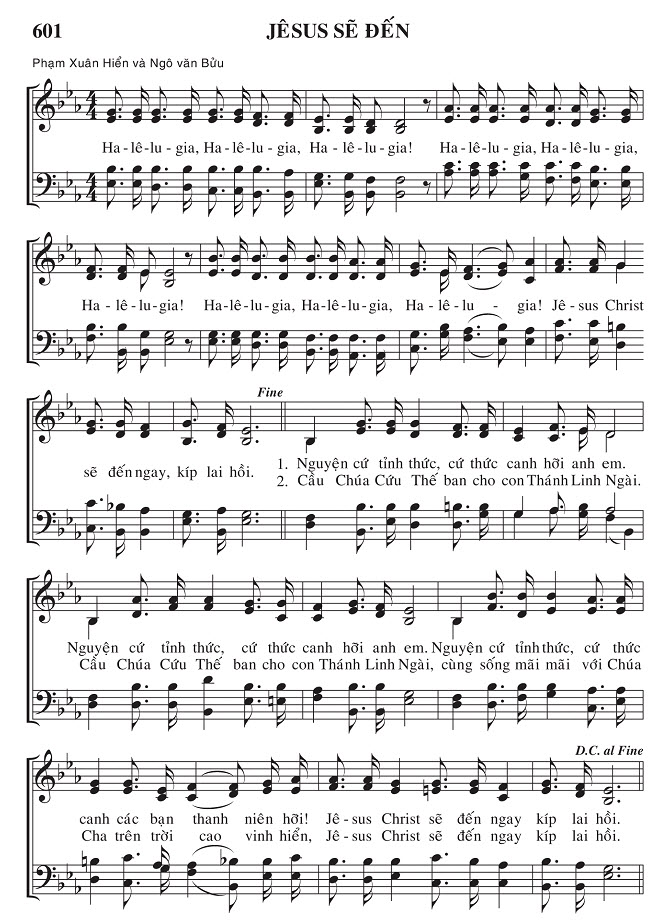 1. Nguyện cứ tỉnh thức, cứ thức canh hỡi anh em. Nguyện cứ tỉnh thức, cứ thức canh các bạn thanh niên hơi! Jê-sus Christ sẽ đến ngay kíp lai hồi. 2. Cầu Chúa Cứu Thế ban cho con Thánh Linh Ngài. Cầu Chúa Cứu Thế ban cho con Thánh Linh Ngài, cùng sống mãi mãi với Chúa Cha trên trời cao vinh hiển, Jê-sus Christ sẽ đến ngay kíp lai hồi. Điệp khúc: Ha-lê-lu-gia, Ha-lê-lu-gia, Ha-lê-lu-gia! Ha-lê-lu-gia, Ha-lê-lu-gia, Ha-lê-lu-gia! Ha-lê-lu-gia, Ha-lê-lu-gia, Ha-lê-lu-gia! Jê-sus Christ sẽ đến ngay, kíp lai hồi.