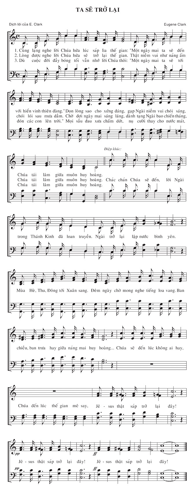 1. Cùng lắng nghe lời Chúa hứa lúc sắp lìa thế gian: "Một ngày mai ta sẽ đến với hiển vinh thiên đàng." Dọn lòng sao cho xứng đáng, gặp Ngài niềm vui chói sáng, chiều, ban trưa hay giữa nắng mai huy hoàng... Chúa sẽ đến lúc không ai hay, Chúa đến lúc thế gian mê say, 2. Lòng được nghe lời Chúa hứa sẽ trở lại thế gian. Thật niềm vui như nắng ấm chói lói sau mưa dầm. Chờ đợi ngày mai sáng láng, dành tặng Ngài bao chiến thắng, chiều, ban trưa hay giữa nắng mai huy hoàng... Chúa sẽ đến lúc không ai hay, Chúa đến lúc thế gian mê say, 3. Dù cuộc đời đầy bóng tối vẫn nhớ lời Chúa thôi: "Một ngày mai ta sẽ tới đón các con lên trời." Mọi sầu đau xưa chấm dứt, nụ cười thay cho nước mắt, chiều, ban trưa hay giữa nắng mai huy hoàng... Chúa sẽ đến lúc không ai hay, Chúa đến lúc thế gian mê say, Điệp khúc: Chúa tái lâm giữa muôn huy hoàng. Chúa tái lâm giữa muôn huy hoàng. Chắc chắn Chúa sẽ đến, lời Ngài trong Thánh Kinh đã loan truyền. Ngài trở lại lập nước bình yên. Mùa Hè, Thu, Đông tới Xuân sang. Đêm ngày chờ mong nghe tiếng loa vang. Ban Jê-sus thật sắp trở lại đây! Jê-sus thật sắp trở lại đây!