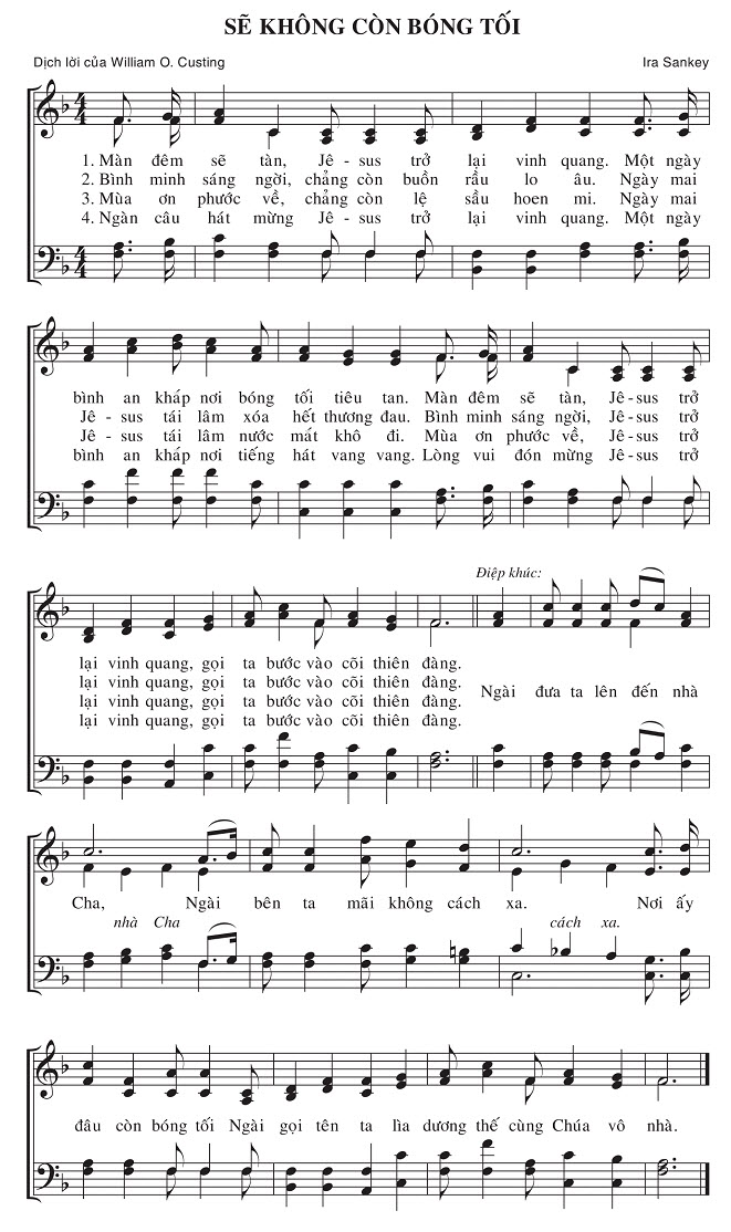 1. Màn đêm sẽ tàn, Jê-sus trở lại vinh quang. Một ngày bình an khắp nơi bóng tối tiêu tan. Màn đêm sẽ tàn, Jê-sus trở 2. Bình minh sáng ngời, chẳng còn buồn rầu lo âu. Ngày mai Jê-sus tái lâm xóa hết thương đau. Bình minh sáng ngời, Jê-sus trở 3. Mùa ơn phước về, chẳng còn lệ sầu hoen mi. Ngày mai Jê-sus tái lâm nước mắt khô đi. Mùa ơn phước về, Jê-sus trở 4. Ngàn câu hát mừng Jê-sus trở lại vinh quang. Một ngày bình an khắp nơi tiếng hát vang vang. Lòng vui đón mừng Jê-sus trở Điệp khúc: lại vinh quang, gọi ta bước vào cõi thiên đàng. Ngài đưa ta lên đến nhà Cha, Ngài bên ta mãi không cách xa. Nơi ấy đâu còn bóng tối Ngài gọi tên ta lìa dương thế cùng Chúa vô nhà.