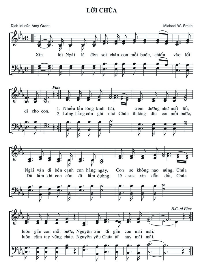 1. Xin lời Ngài là đèn soi chân con mỗi bước, chiếu vào lối đi cho con. Nhiều lần lòng kinh hãi, xem dường như mất lối, Ngài vẫn đi bên cạnh con hàng ngày, Con sẽ không nao núng, Chúa luôn gần con mỗi bước, Nguyện xin đi gần con mãi mãi. 2. Xin lời Ngài là đèn soi chân con mỗi bước, chiếu vào lối đi cho con. Lòng hàng còn ghi nhớ Chúa thương dìu con mỗi bước, Dù lắm khi con còn đi lầm đường, Jê - sus xin dẫn dát, Chúa luôn cầm tay vững chác. Nguyện yêu Chúa từ nay mãi mãi.