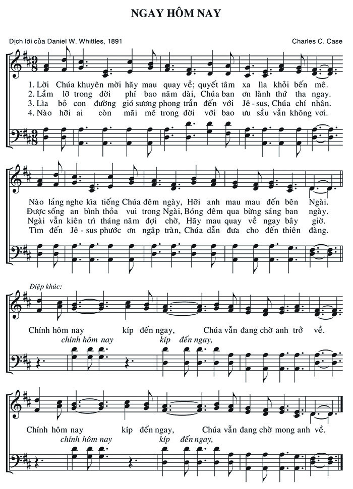 1. Lời Chúa khuyên mời hãy mau quay về; quyết tâm xa lìa khỏi bến mê. Nào láng nghe kìa tiếng Chúa đêm ngày, Hỡi anh mau mau đến bên Ngài. 2. Lầm lỡ trong đời phí bao năm dài, Chúa ban ơn lành thứ tha ngay. Được sống an bình thỏa vui trong Ngài, Bóng đêm qua bừng sáng ban ngày. 3. Lìa bỏ con đường gió sương phong trần đến với Jê-sus, Chúa chí nhân. Ngài vẫn kiên trì tháng năm đợi chờ, Hãy mau quay về ngay bây giờ. 4. Nào hỡi ai còn mãi mê trong đời với bao ưu sầu vẫn không vơi. Tìm đến Jê-sus phước ơn ngập tràn, Chúa dẫn đưa cho đến thiên đàng. Điệp khúc: Chính hôm nay kíp đến ngay, Chúa vẫn đang chờ anh trở về. chính hôm nay kíp đến ngay, Chính hôm nay kíp đến ngay, Chúa vẫn đang chờ mong anh về. chính hôm nay kíp đến ngay,