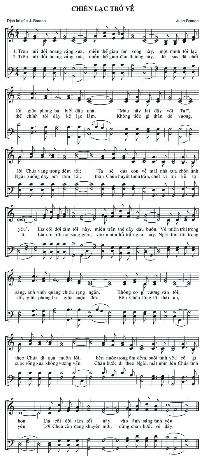 1. Trên núi đồi hoang vắng xưa, miền thế gian hư vong này, một mình tôi lạc lối giữa phong ba biết đâu nhà. "Mau hãy lại đây với Ta!", lời Chúa vang trong đêm tối; "Ta sẽ đưa con về mái nhà xưa chốn tình yêu". Lìa cõi đời tăm tối này, miền trần thế đầy đau buồn. Về miền trời trong sáng, ánh vinh quang chiếu rạng ngần. Không có gì vương vấn tôi, theo Chúa đi qua muôn lối, bên nước trong êm đềm, suối tình yêu có gì hơn. Lìa cõi đời tăm tối này, vào ánh sáng tình yêu. 2. Trên núi đồi hoang vắng xưa, miền thế gian đau thương này, Jêsus đã chết thế chính tôi đây kẻ lạc lầm. Không tiếc gì thân đế vương, Ngài xuống đây nơi tăm tối, thân Chúa huyết tuôn tràn, chết vì tôi kẻ tội ô. Lìa cõi trời nơi sang giàu, vào muôn lối trần gian này. Ngài tìm tôi trong tối, giữa phong ba giữa cuộc đời. Bên Chúa lòng tôi thái an, Chân bước đi theo Ngài, mát nhìn lên Chúa tình yêu. Lời Chúa còn đang khuyên mời, dừng chân bước về đây.