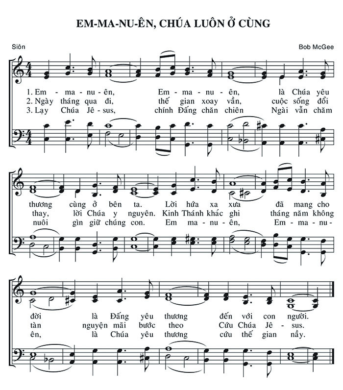 1. Em-ma-nu-ên, Em-ma-nu-ên, là Chúa yêu thương cùng ở bên ta. Lời hứa xa xưa đã mang cho đời là Đấng yêu thương đến với con người. 2. Ngày tháng qua đi, thế gian xoay vần, cuộc sống đổi thay, lời Chúa y nguyên. Kinh Thánh khác ghi tháng năm không tàn nguyện mãi bước theo Cứu Chúa Jê-sus. 3. Lạy Chúa Jê-sus, chính Đấng chăn chiên Ngài vẫn chăm nuôi gìn giữ chúng con. Em-ma-nu-ên, Em-ma-nu-ên, là Chúa yêu thương cứu thế gian nầy.